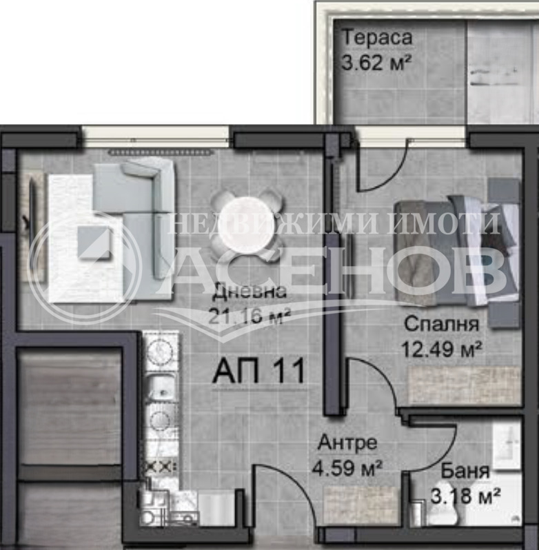 ФУНКЦИОНАЛНО РАЗПРЕДЕЛЕНИЕ: антре, дневна с кухненски бокс, спалня, баня с тоалетна, балкон.