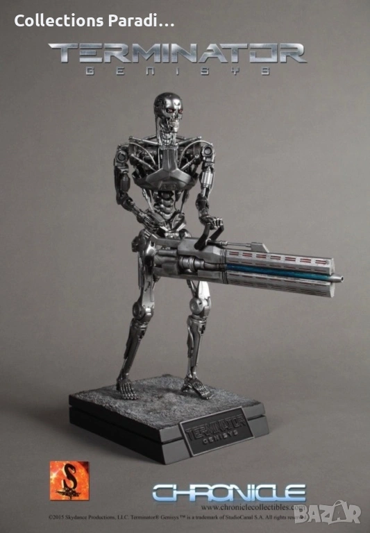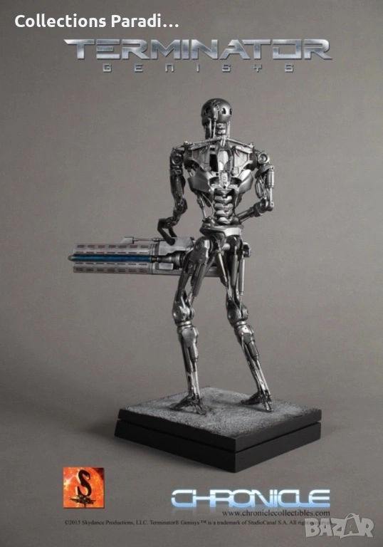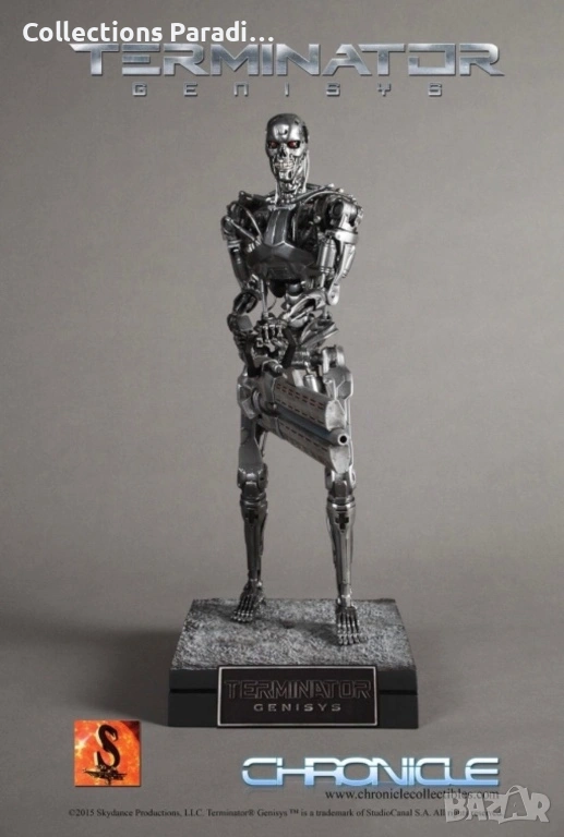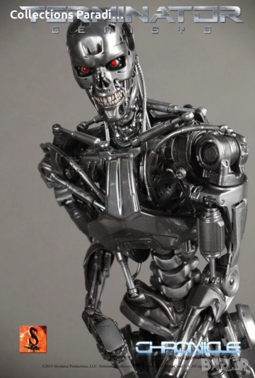 Chronicle Collectibles представя тази впечатляваща статуя от Terminator Genisys в мащаб 1:4. За да се гарантира прецизност и детайлност, Терминаторът е моделиран въз основа на оригиналните дигитални файлове и е боядисан с хромирана техника, използвана също за всички ендоскелети във филма от Legacy Effects. Фигурата е изобразена в позиция за ходене с голямата ендо-пушка от филма.