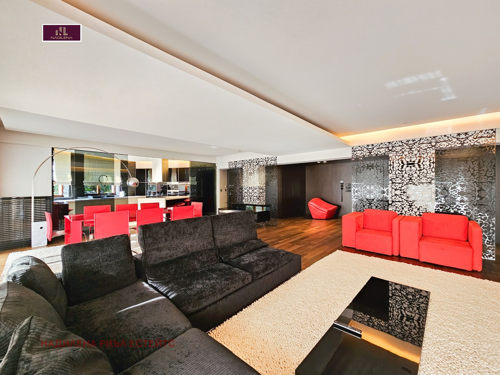 В КОМПЛЕКС МАКСИ! Отдава се под наем дизайнерски обзаведен апартамент с площ от 290м2, ет. 3/от 5, с асансьор, отоплението е на газ, но има поставено и алтернативно електрическо котле. Комплексът е изключително предпочитан, заради локацията-в близост до планината, контролирания достъп, многото зеленина, детски площадки, наблизо има Фантастико, Кауфланд, Френската детска градина и училище 'Виктор Юго' и т.н. Жилището е изпълнено с висок клас материали, поръчково обзавеждане и оборудване. Вътрешното разпределение е следното: антре, представителен хол, трапезарна част и кухня с маркови ел. уреди. От хола се излиза на една прекрасна веранда с гледка към зеленина. Отделно огромна родителска спалня със собствена гардеробна, баня с тоалетна, излаз на балкон, още 3 спални и 3 бани с тоалетни, едната спалня е също с балкон, мокро помещение. Навсякъде са поставени модерни осветителни тела и аксесоари. Като цяло имотът е изключително стилно направен, с много вкус и усет към всички детайли, освен това предлага истинско спокойствие и хубава гледка отвсякъде. Има възможност да се наеме огромен гараж за 2 коли със складова част, като за удобство има и директна връзка към сградата-200EUR. Собственост е на юридическо лице. За допълнителни въпроси се обръщайте към Надя Антова-088/9999 413, 0888/788 420, Васил-0899/18 35 80, Елена-0898/60 55 33
