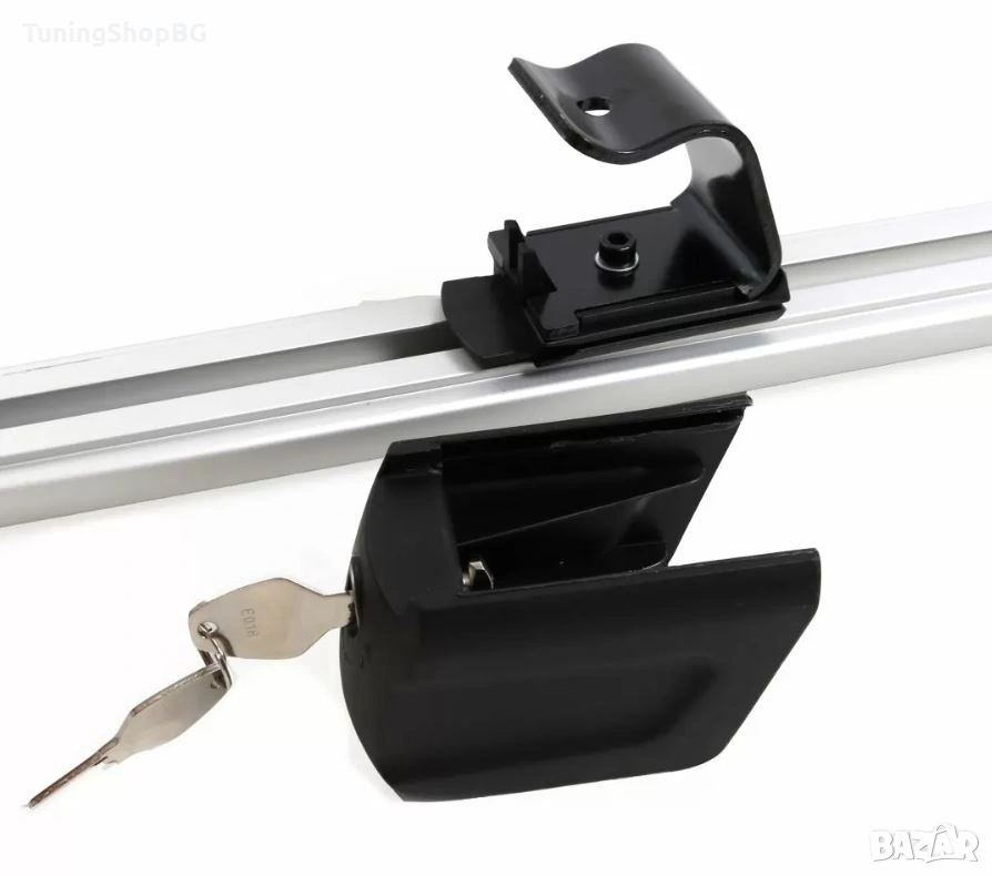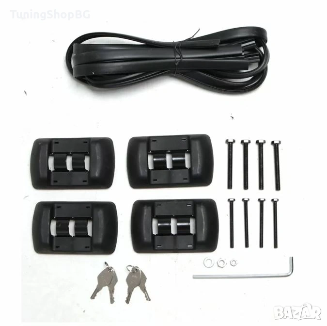 Комплекта включва: 2 напречни алуминиеви греди и механизъм за закрепяне със заключващ механизъм, 4 винта 6мм и 4 винта 8мм, 8 гайки, 4 шайби, 4бр. гумени уплътнения за горната и долната част и 2 ключа