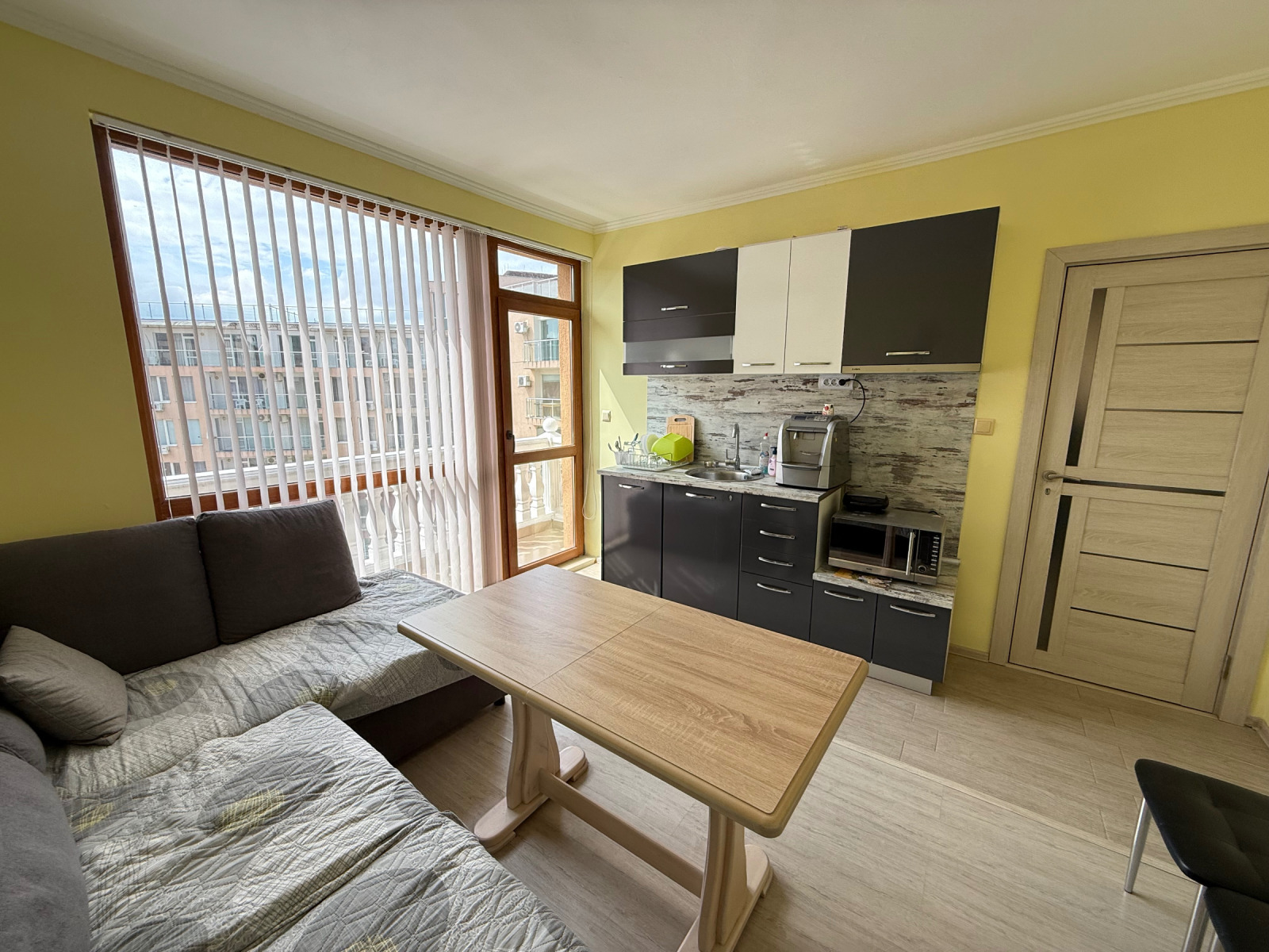 Разпределението е функционално и удобно, като предлага всичко необходимо за комфортен престой. Жилището е светло и приветливо, с приятна атмосфера и усещане за уют. Голямо предимство е липсата на такса поддръжка, което го прави отличен избор както за лично ползване, така и за инвестиция с добра възвръщаемост . Локацията в непосредствена близост до плажа осигурява бърз достъп до морето, заведения, магазини и всички удобства, които курортът предлага.