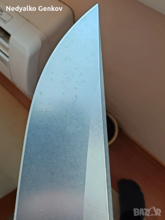 7. Real Steel Sorrow - стомана D2, чирени G10, острие 12.6 см, цялостна 26.4 см, дебелина 4.5 мм, дръжка 14 см, доста удобна поне за мен. Кания от Кайдекс. Не е разнасян, не е заточван, рязал е мезе няколко пъти. Предвид това, че Д2 не е напълно неръждаема стомана, са се появили няколко петънца от двете страни на острието. Опитал съм да ги снимам. Пълен комплект - кутия, книжки
