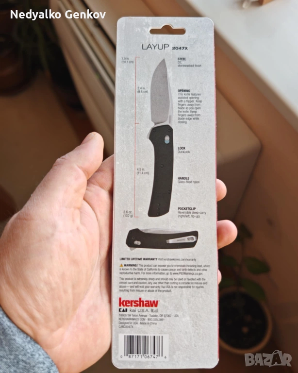 5. Kershaw Layup - D2 стомана (Stonewashed), заключване на острието DuraLock, 8.6 см острие, 20.1 см дължина на ножа. Нов, запечатан. В този случай опцията е само преглед, но не и тест на пратката, за да не се наруши целоста на опаковката -