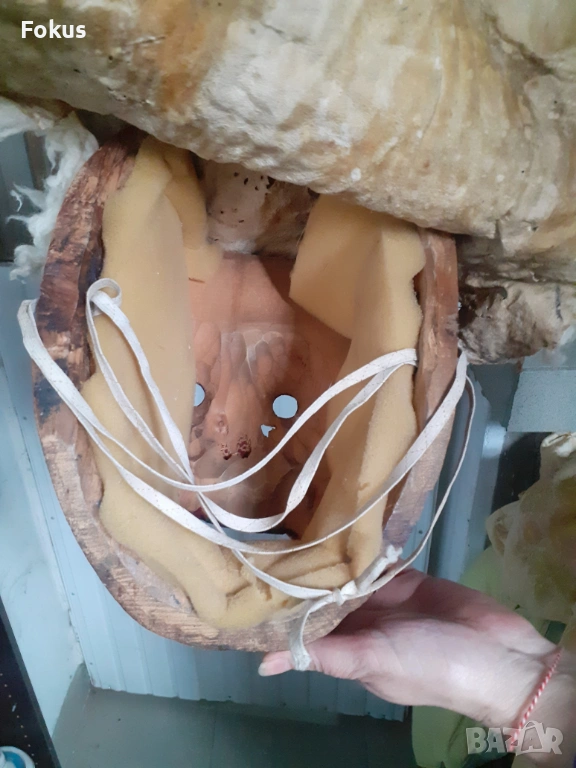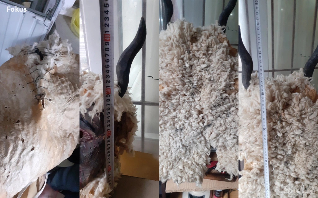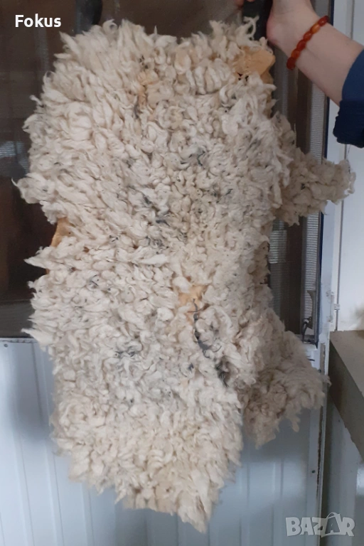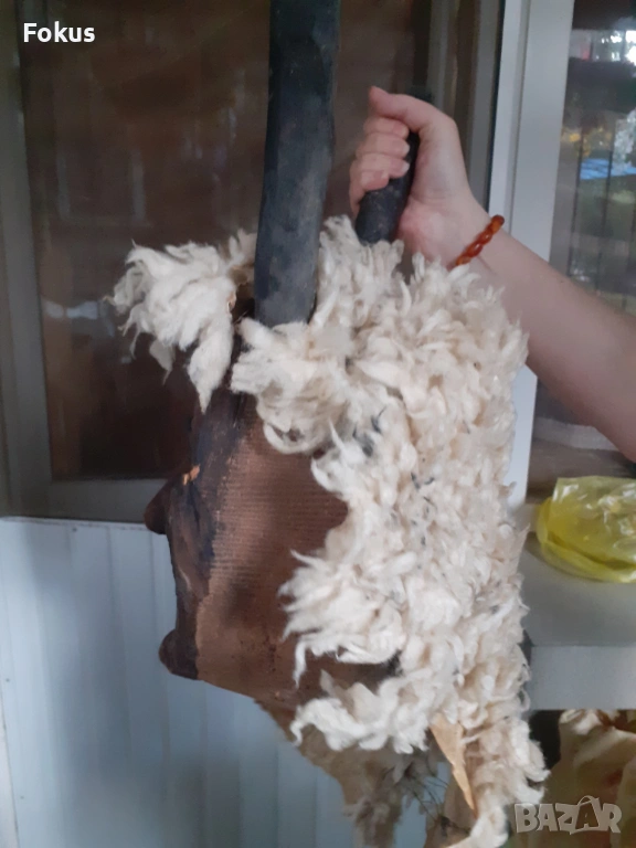 Изработена е с дърворезба от здраво масивно дърво, което е в много добро състояние и цяло парче овча кожа, която има доста забележки, видно от снимките.
