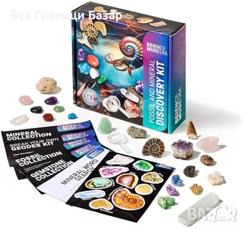 Образователен комплект с истински фосили, минерали, кристали и полирани скъпоценни камъни