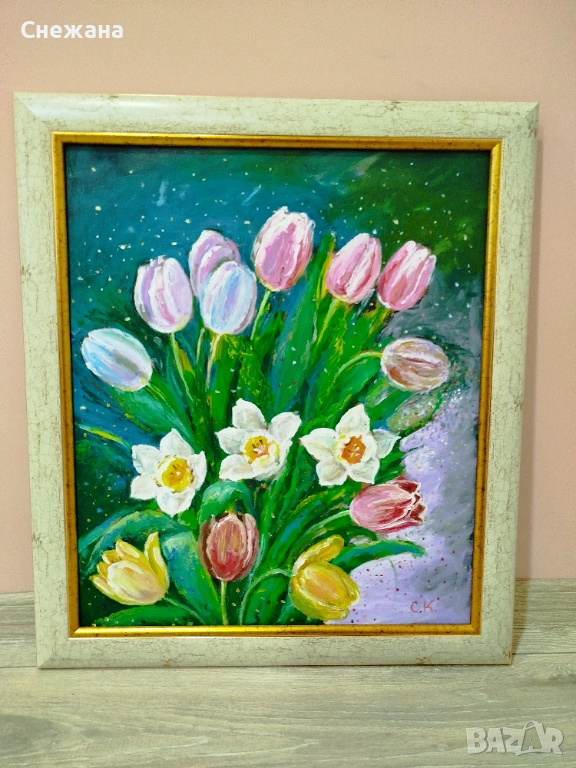 Голяма картина "Пролетни цветя" маслени бой .Идеален подарък за всеки ценител на изкуството.