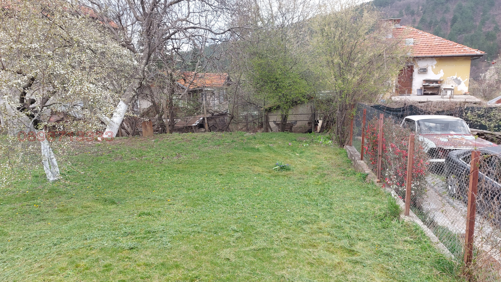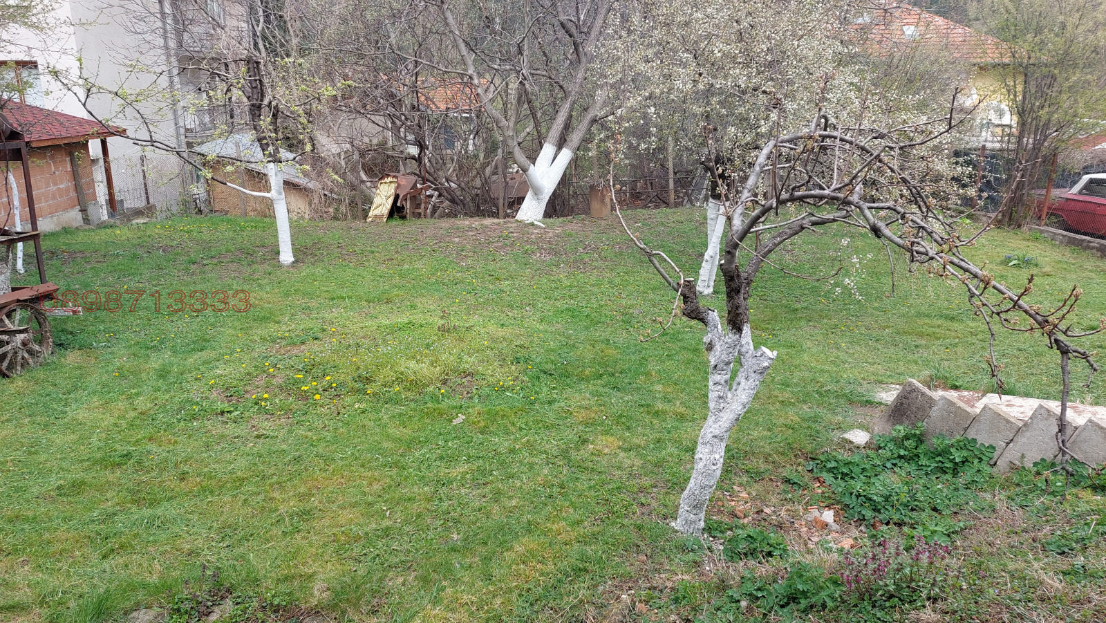 Равен слънчев двор на две нива с денивилация 1,2 метра, зелената му част е над 600 м2, с голям орех, череша, вишна, две круши и дюля, които не биха попречили, независимо от визията ви за тази част на имота - комфорт за босите крака на малките ви наследници, кът за отмора с басейн и барбекю или лехи с домашни зеленчуци.