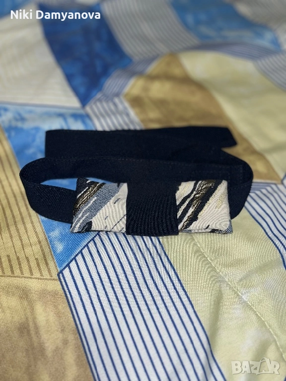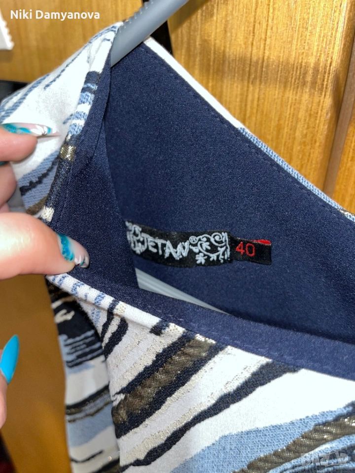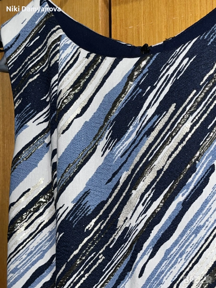 Продавам чисто нова, не обличана рокля с елегантен дизайн. Горната част е с ефектен принт и златисти нишки, а долната е разкроена пола в тъмносиньо. Роклята има подплата, която не позволява прозиране и придава по-добра форма. Моделът е изключително подходящ за по-ниско момиче (размер S/M). Към нея има и тематичен аксесоар в същия десен. Идеална за официален повод или стилно ежедневие. Изпращам с преглед и тест.