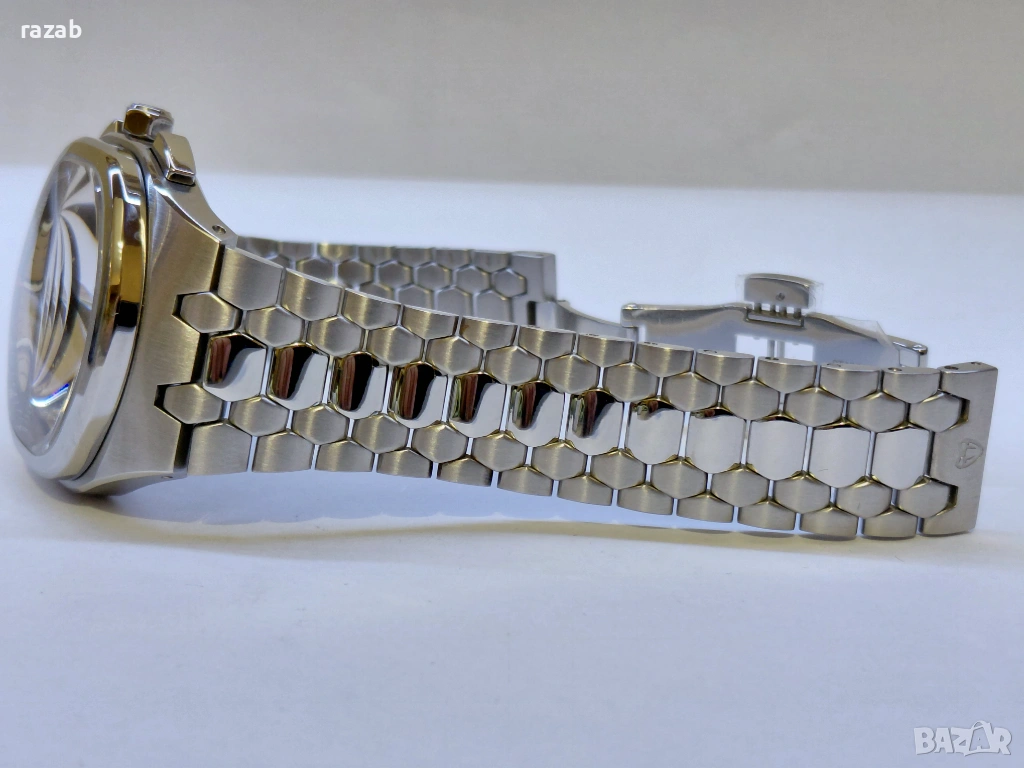 В сърцето на хронографа Granturismo е механизмът Seiko VK64 Meca-Quartz , сложна хибридна система, която съчетава кварцова прецизност с механичното усещане на традиционния хронограф. За разлика от стандартните кварцови механизми, той разполага с механичен хронографски модул, който осигурява ясна обратна връзка при натискане и незабавно нулиране, точно както при професионалните състезателни хронографи. Централната стрелка на хронографа се движи плавно по циферблата, подобрявайки както четливостта, така и визуалното усъвършенстване. Изработен от висококачествени материали и оборудван с винтова шестоъгълна коронка с голяма гравирана змия и 100-метрова водоустойчивост, той осигурява надеждна работа във всяка среда. Часовникът има патентована интегрирана верига, наподобяваща змийско тяло. Тя е резултат от вътрешен дизайн, насочен към осигуряване на изключителна уникалност и несравним комфорт на китката.