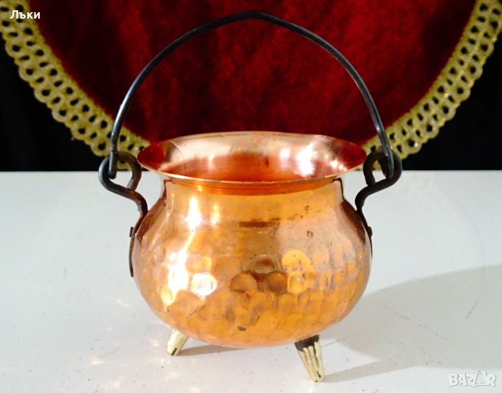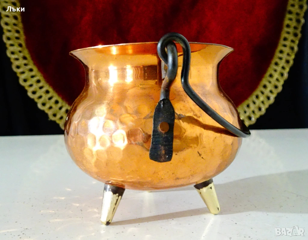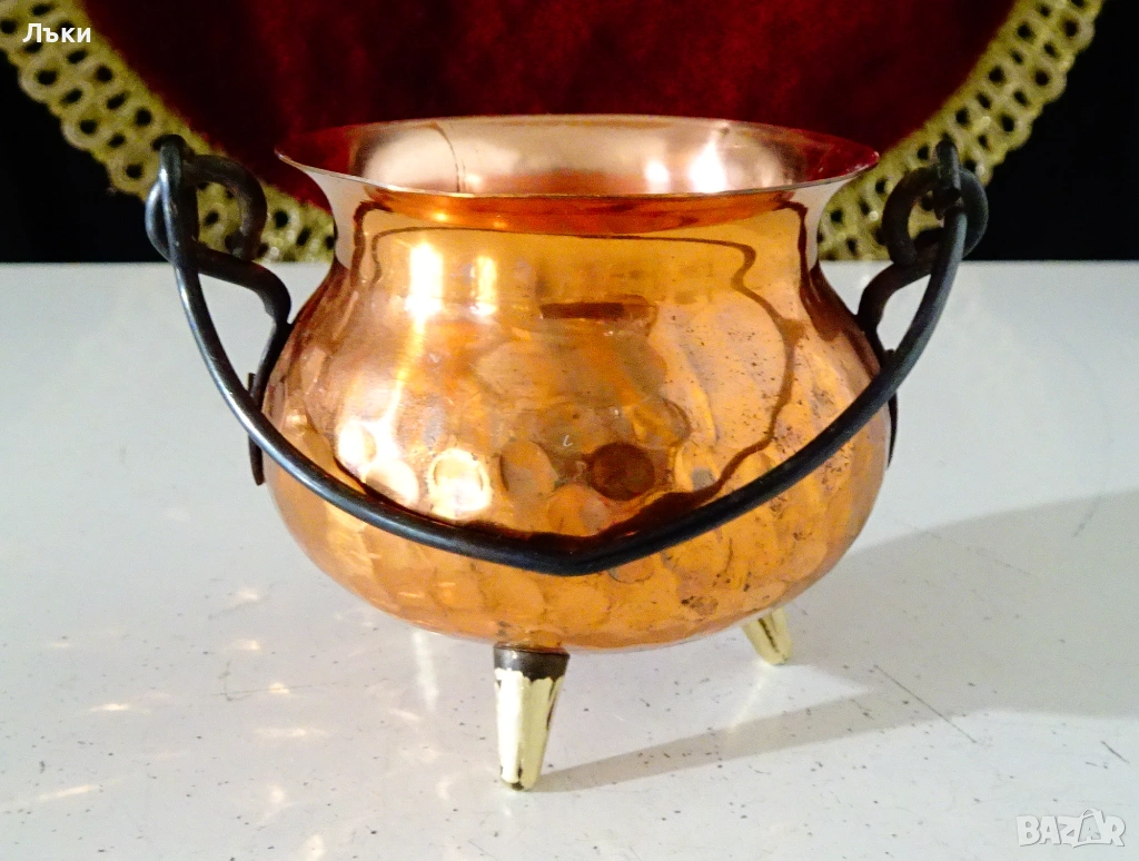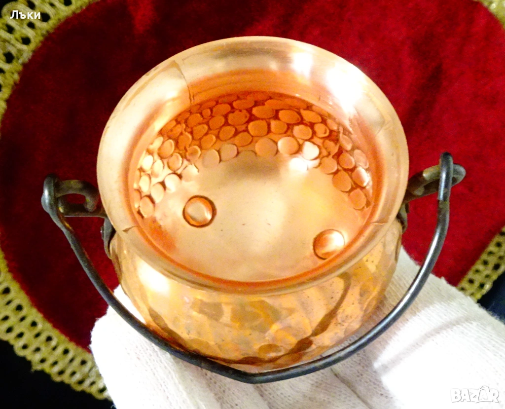 дръжка,занитена за съда с медни нитчета.Височина с дръжката 10 см.,височина без
