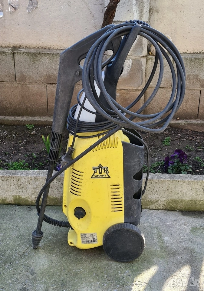 Продавам надеждна водоструйка Top Craft, подходяща за почистване на автомобили, мотори, дворове, фасади и градинска техника. Машината е здрава и работи перфектно лесна за употреба, с вградени колела за удобно преместване.