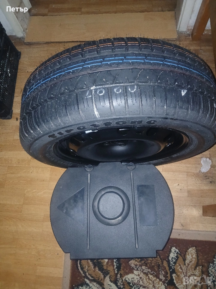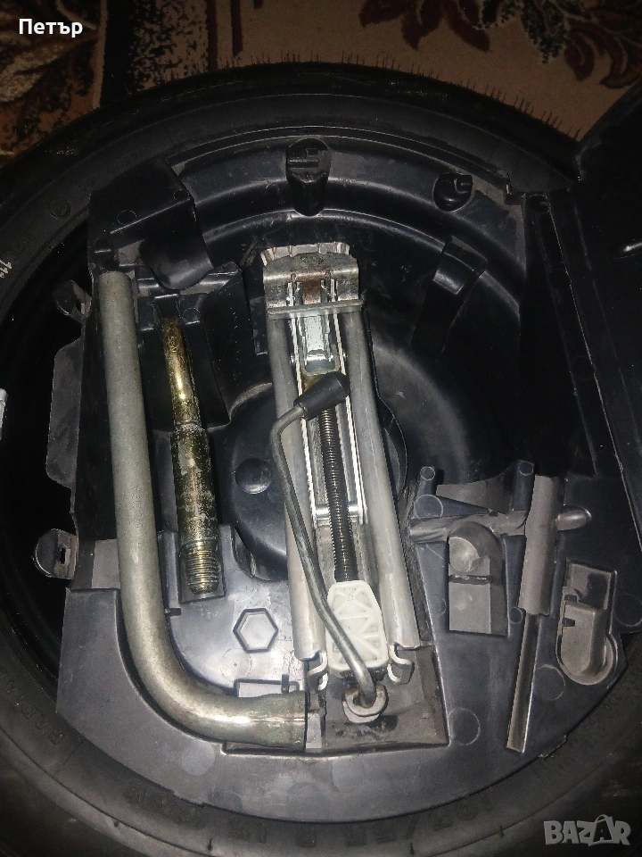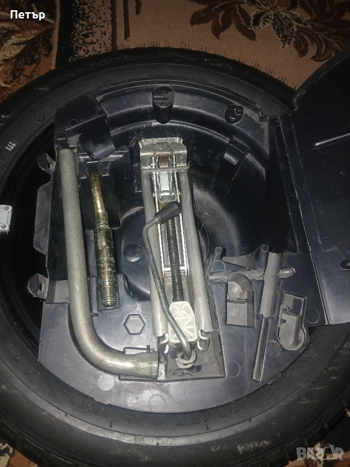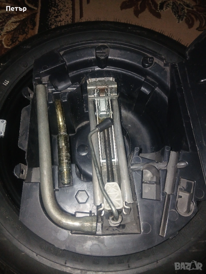 Цената е за комплекта чисто нова резервна гума с органайзер пълен с оргиналните инструменти крик,ключ,и кука.