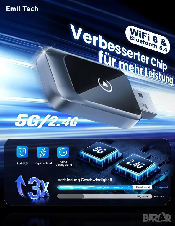 Безжичен CarPlay / Android Auto адаптер – Bluetooth 5.4, WiFi 6, USB-A/USB-C, нов