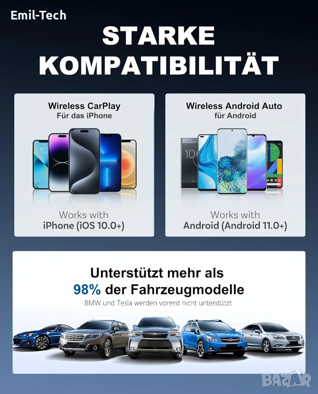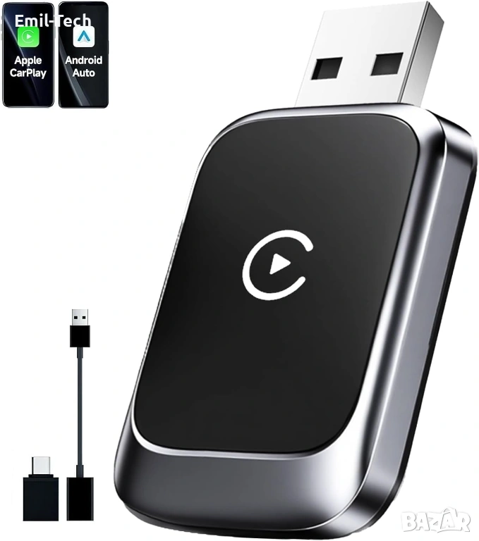 Преди покупка проверете дали автомобилът ви поддържа стандартен кабелен CarPlay / Android Auto, защото адаптерът не добавя тази функция, а я прави безжична.