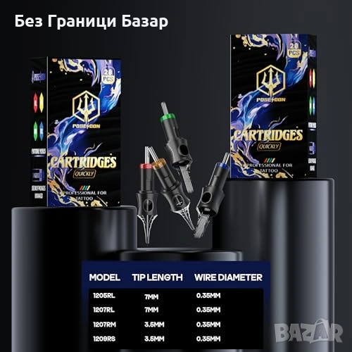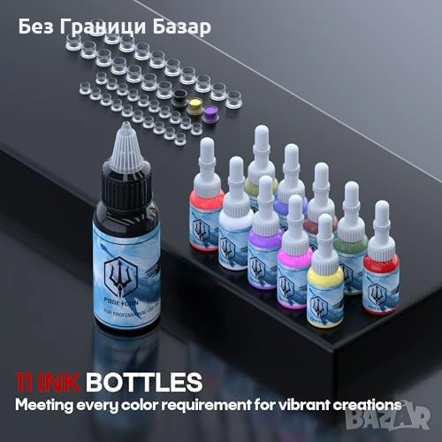 Комплектът включва 20 стерилни игли, черно мастило 30 ml, цветни мастила и тренировъчна кожа