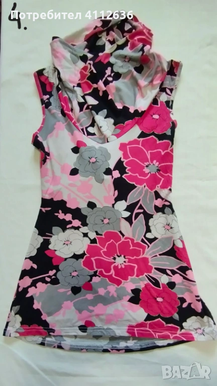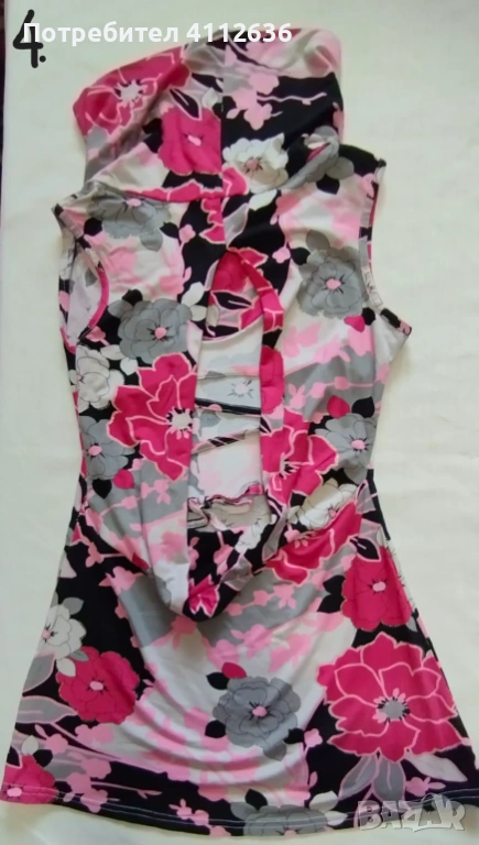 с цветя в розово, бяло и черно, с отворен гръб и връзки през гърба.