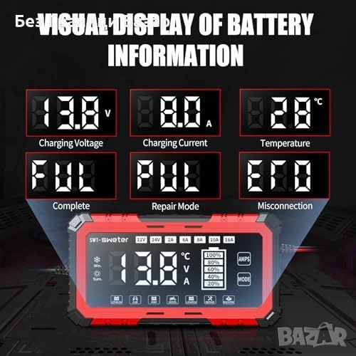 Работи с AGM, GEL, SLA, flooded и LiFePO4 батерии
