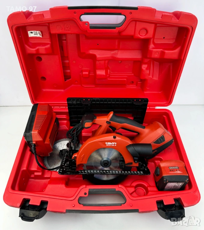 Продавам акумулаторен ръчен циркуляр на Хилти като нов, както се вижда на снимките и работи брилянтно без никакви забележки, внос от Франция. Обявената цена включва машината, адаптер за плота, водач, 2 диска на хилти за метал и дърво, 2 броя батерии по 22V 5.2Ah с индикатор, бързо зарядно и оригинален куфар. Пращаме с опция преглед и тест с куриерска фирма еконт може и лично предаване за гр. Шумен.
