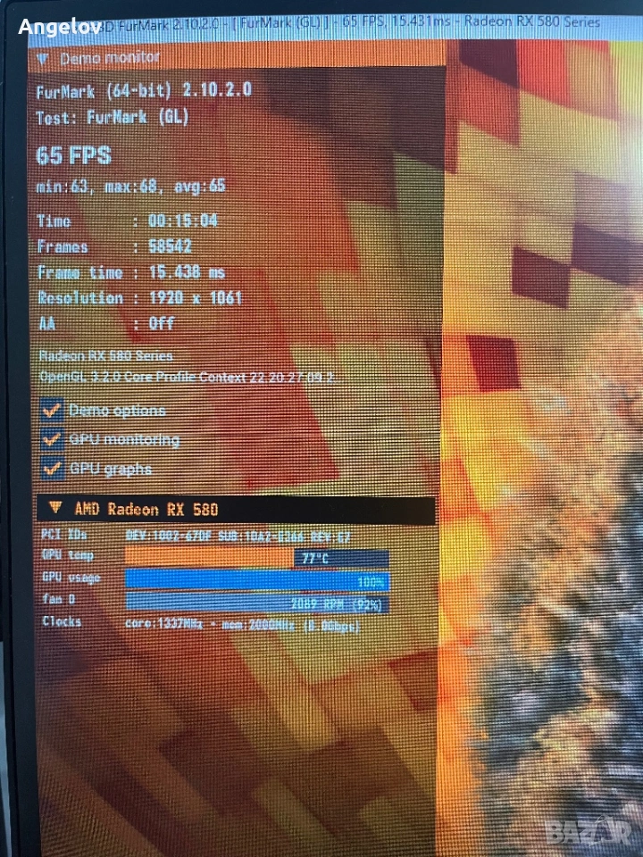 • Видеокарта: Тествана с Furmark – стабилна работа и безшумни вентилатори, картата не вдигна над 78 градуса, което е перфектно за такова тежко натоварване, тествани са и вентилаторите, като и те са в перфектно състояние.