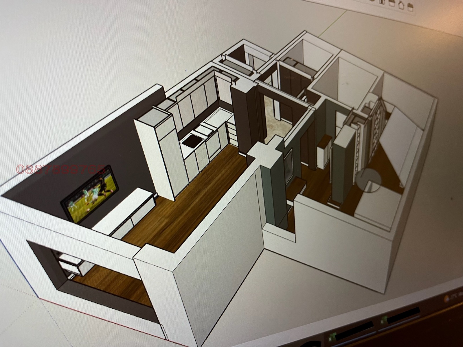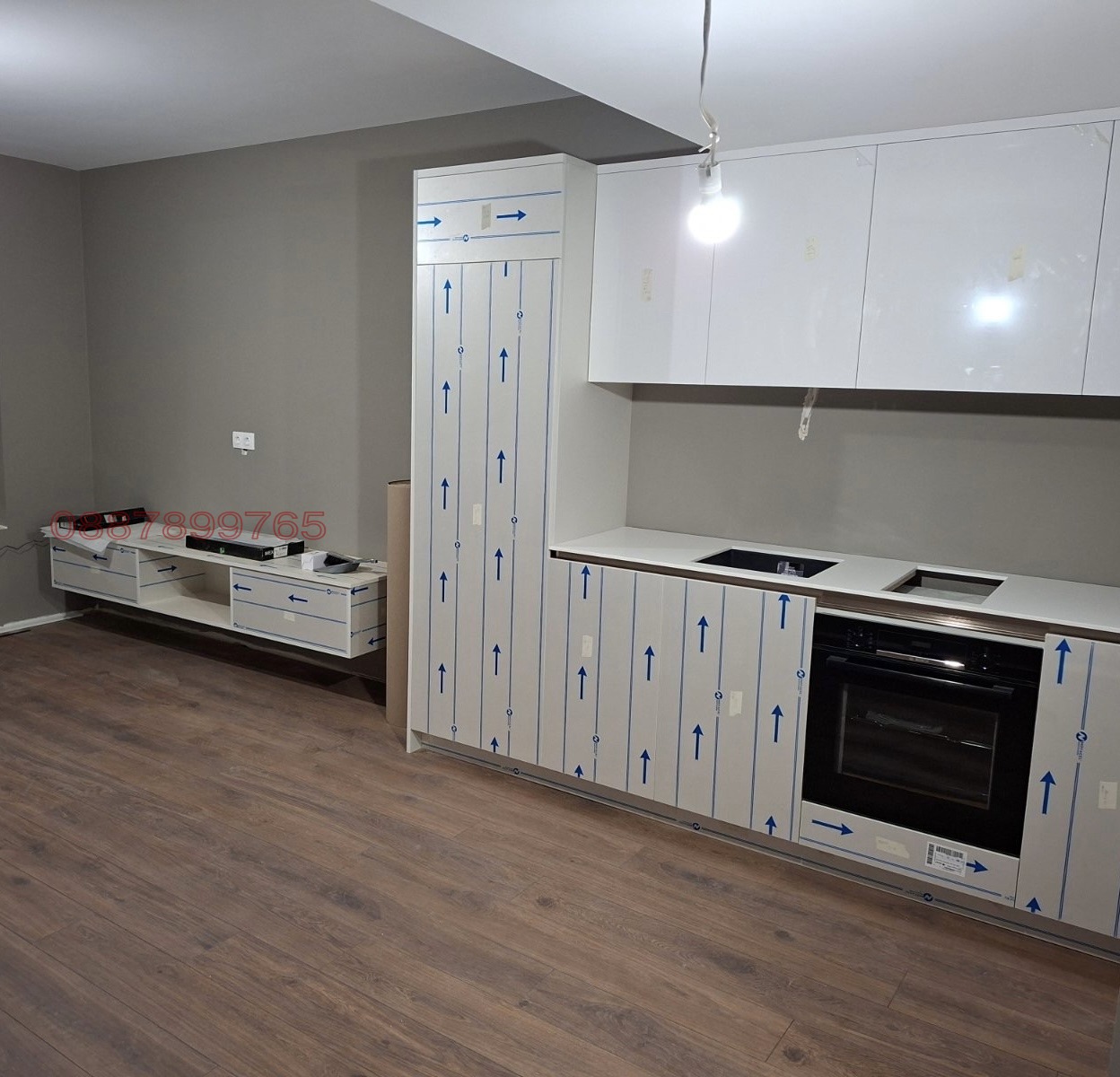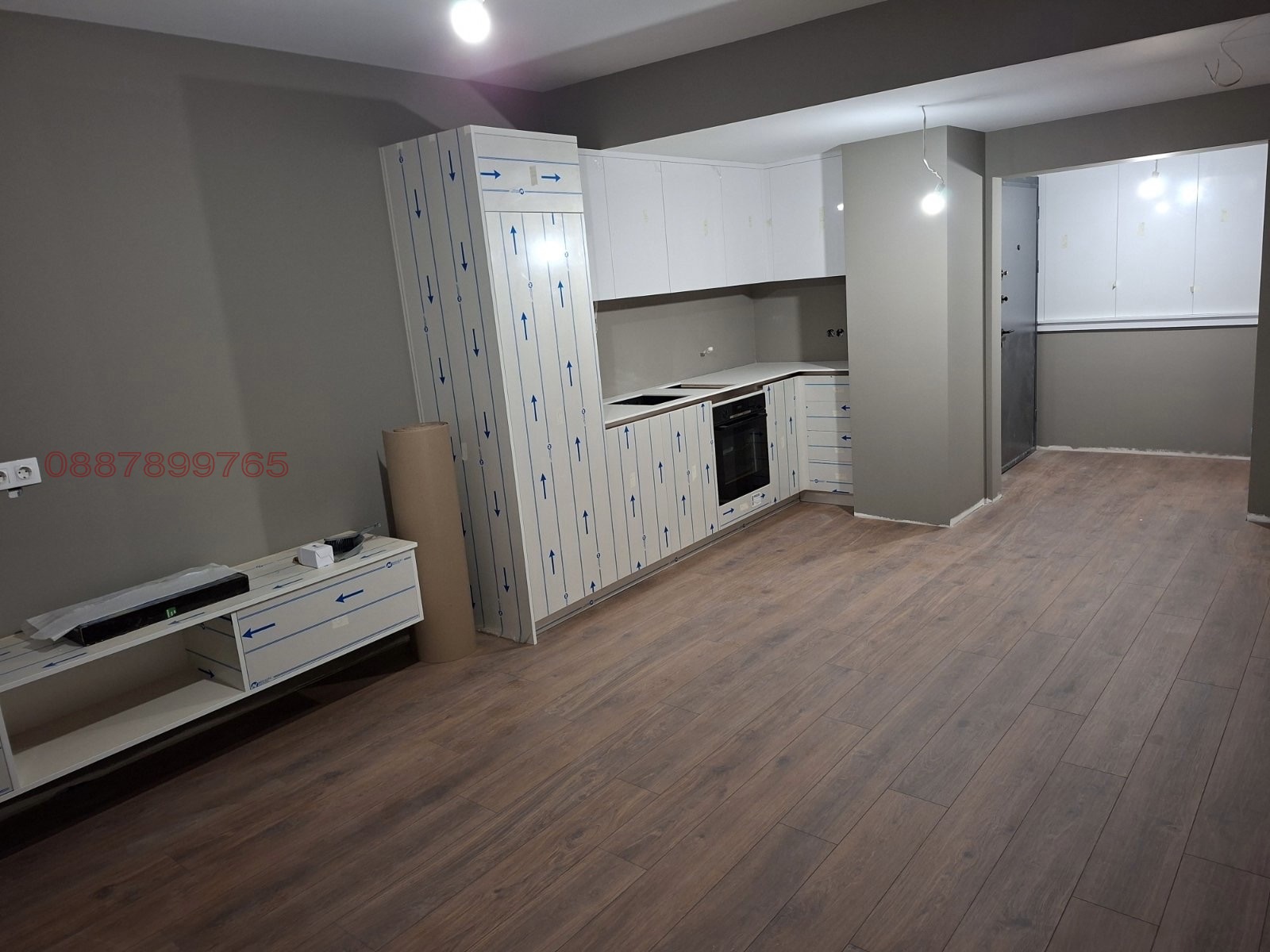 Както е видно от снимките - в момента тече финалният етап от обзавеждането - монтиране на мебели по поръчка и закупени мебели като диван, трапезна маса и спалня. Ще бъде готов на 20 април.