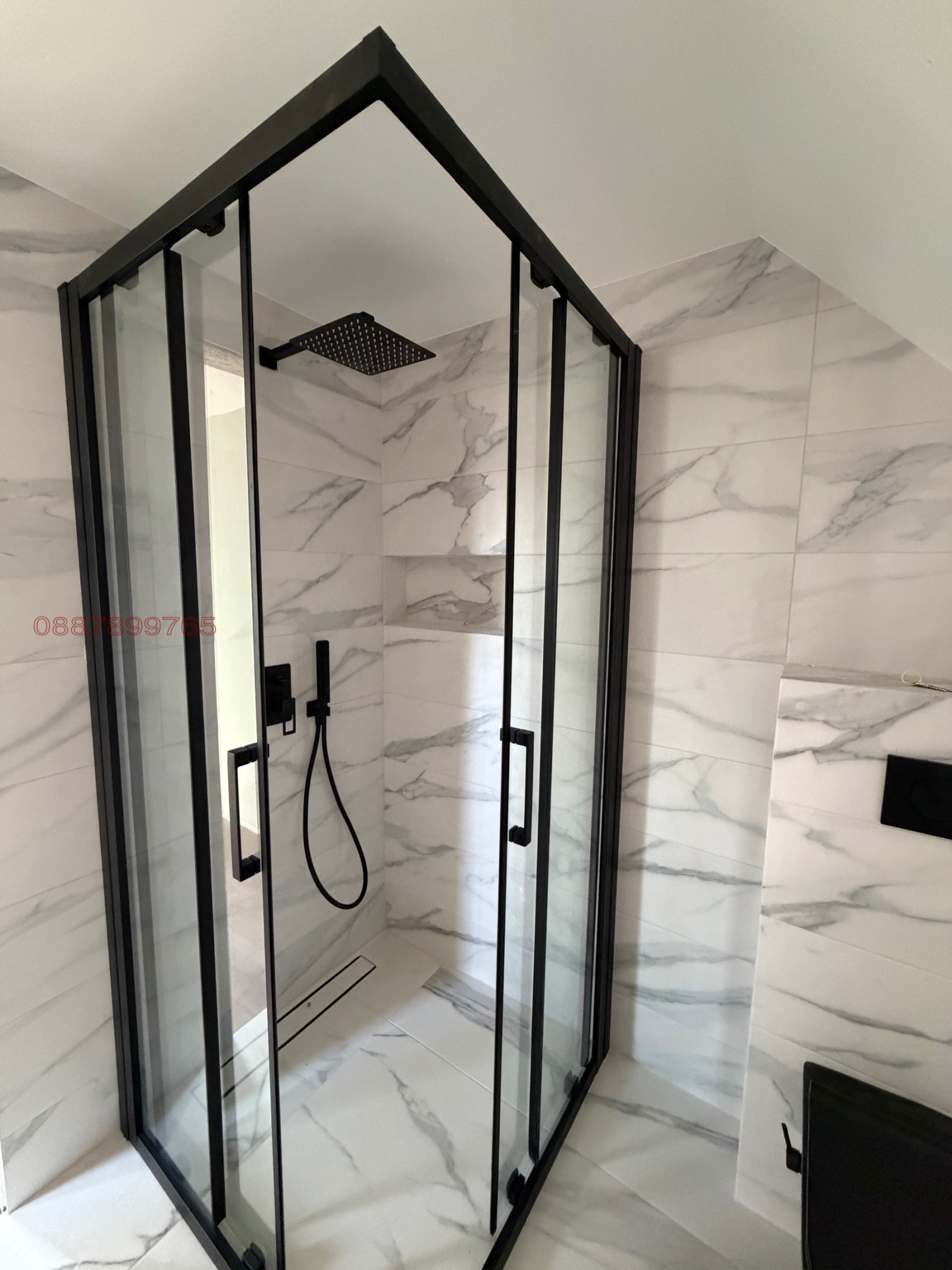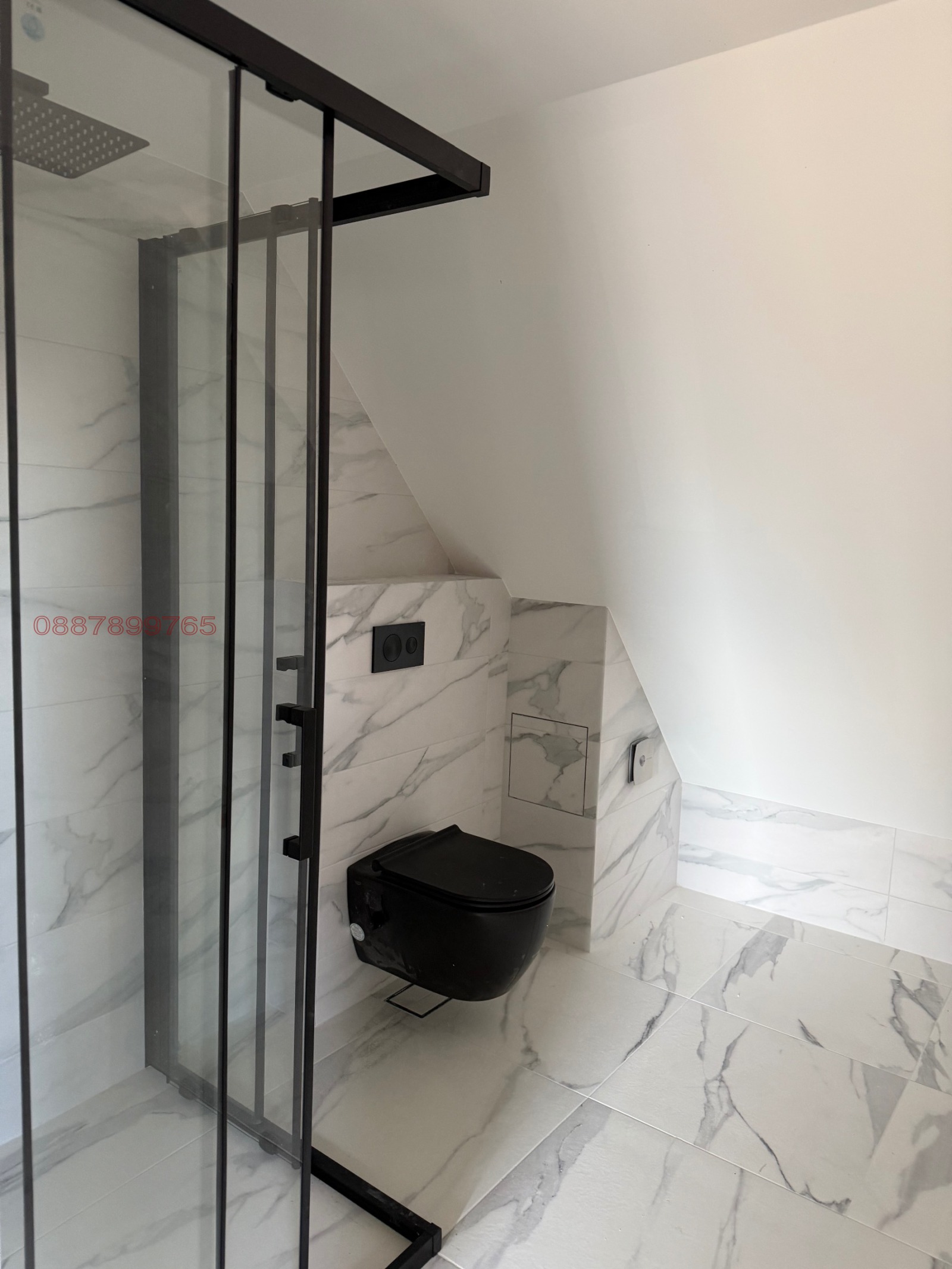 Висок клас на изпълнение на баня - мраморна шарка на гранитогрес + изцяло черни смесители, тоалетна с биде, душ кабина и вграден душ. При нужда - може да се монтира електрическа лира за отопление на банята. Инсталиран е колонен филтър на водата за целия апартамент.