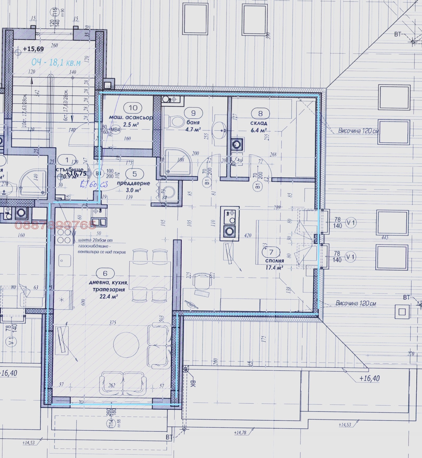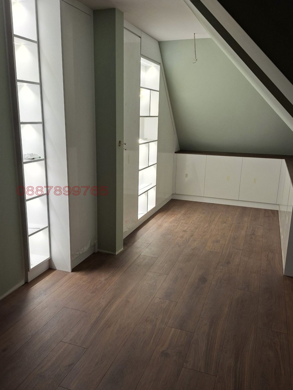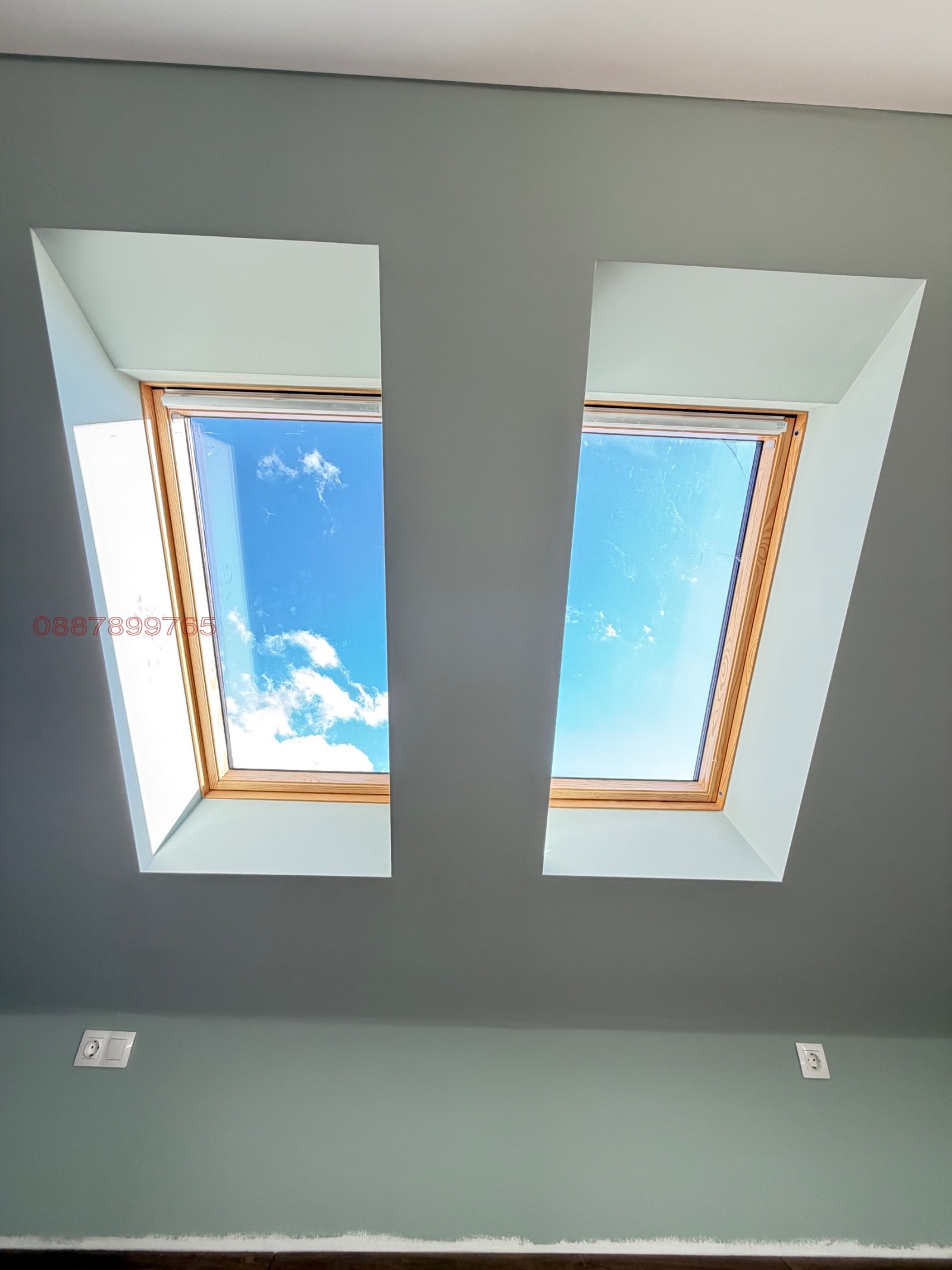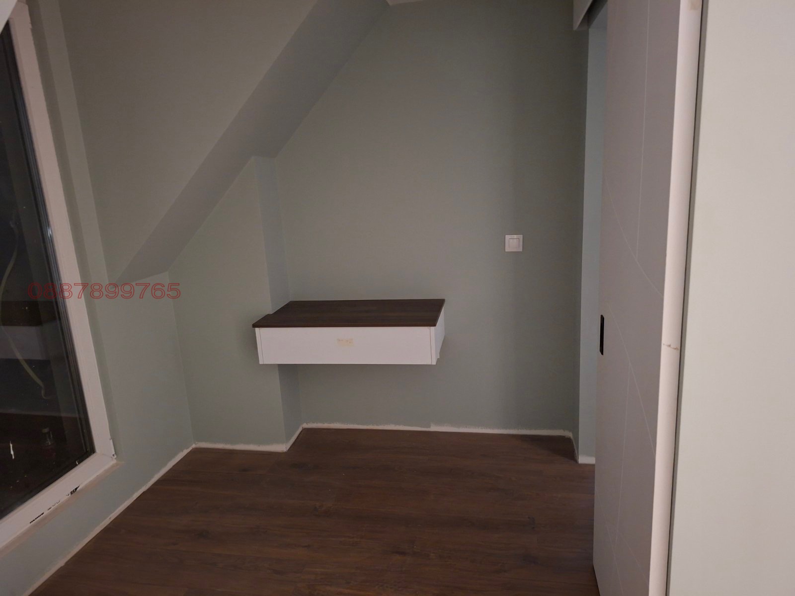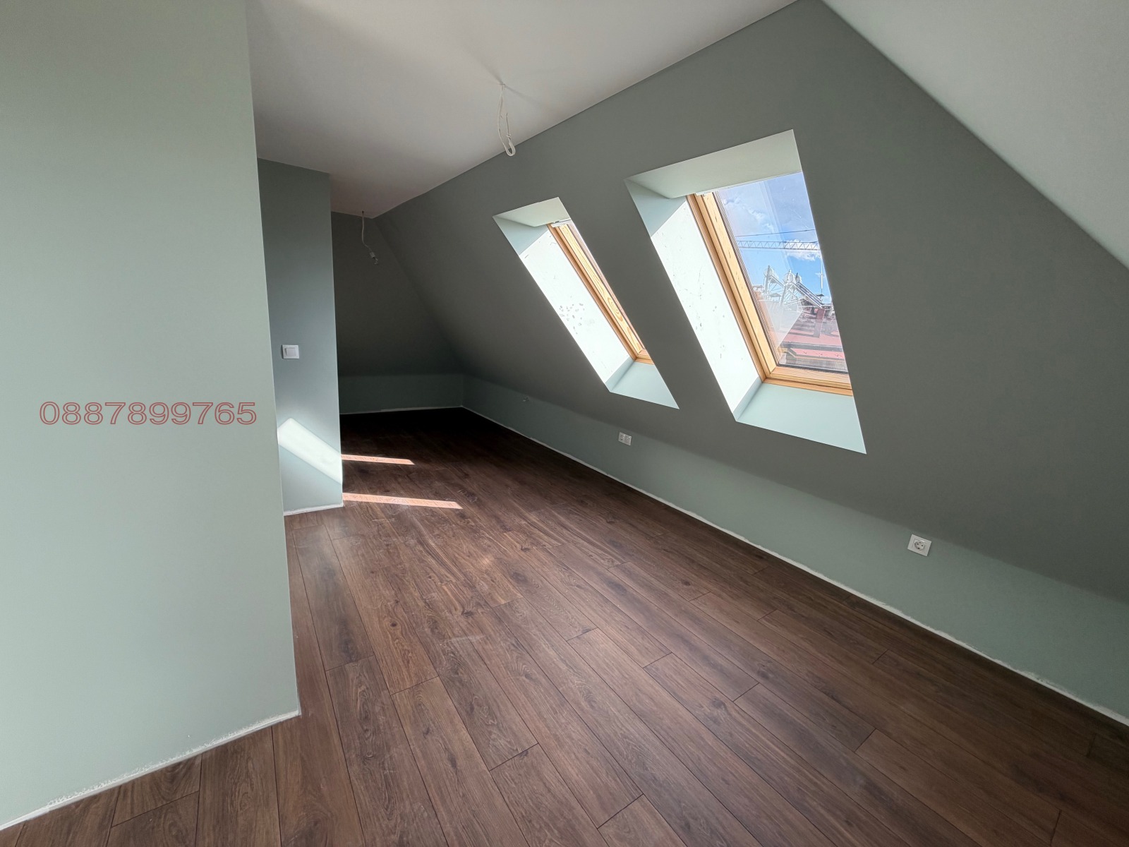 Апартаментът е със скосявания традиционни за последен етаж. Има два прозореца Velux точно над спалнята (ще имат щора).