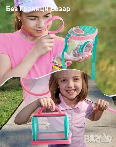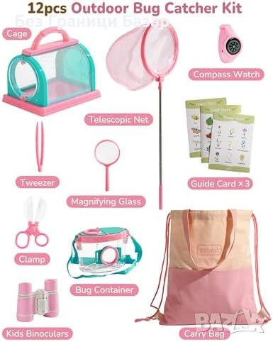 Включва контейнер и клетка за насекоми, мрежа за пеперуди, бинокъл, лупа и часовник с компас