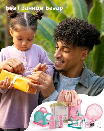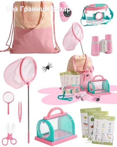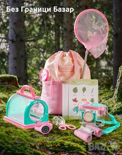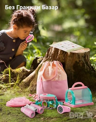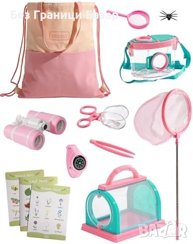 Нов Детски комплект за изследване на природата 13 части розов с бинокъл лупа и мрежа