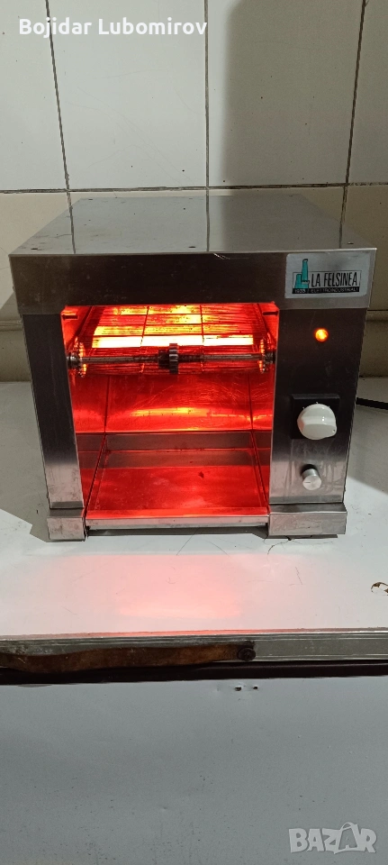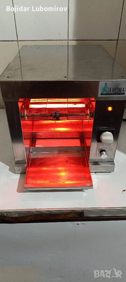 На вашето внимание продавам , професионален тостер конвейер . Работи чудесно , редуктор за контрол на скороста на движение , 4 степени на нагревателите, тавичка в която падат филийките автоматично . Размерите са 37/46/35см , Бъдете здрави.