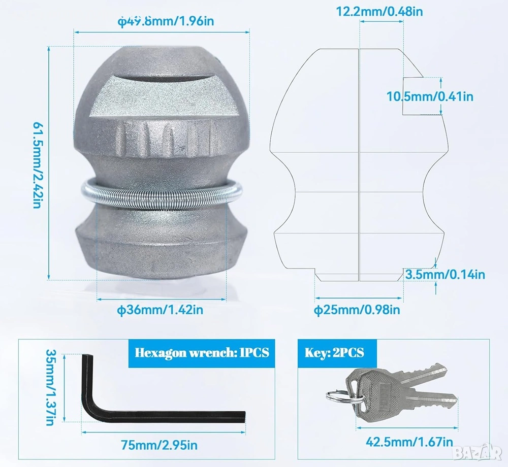 Монтира се директно върху теглича и предотвратява неоторизирано закачане към автомобил, като осигурява високо ниво на сигурност при паркиране или съхранение.