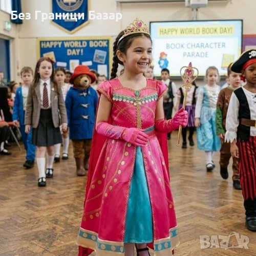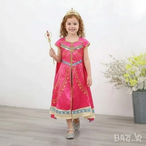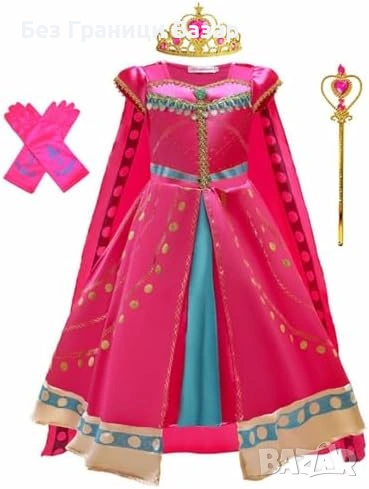 Детски комплект принцеса в розово с рокля, пелерина, диадема, вълшебна пръчка и ръкавици