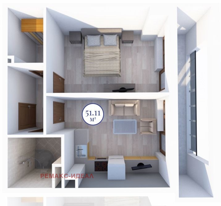 С площ от 51 кв.м., той се състои от дневна с кухненска част, спалня, килер, санитарен възел, голяма тераса с прекрасна гледка към града.