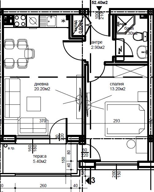 Дневна с трапезария и кухненски бокс, спалня, баня с тоалетна, склад, антре, тераса