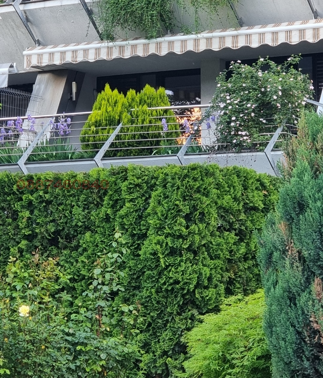 Изложението е изцяло юго-запад, изглед към вътрешен двор с прекрасна градина, площ: 65 кв.м., етаж: 2. Разпределението е: хол с кухненски бокс, спалня с дрешник, баня с вана, тоалетна за гости, сухо помещение (с пералня и рафтове за обувки и вещи. Към апартамента има много просторна 20 кв тераса с мини-градина, към която имат излаз и двете стаи.