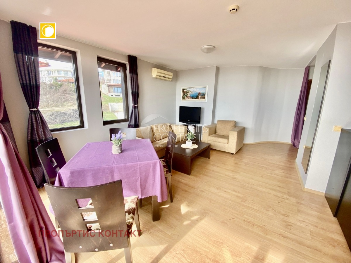 Продава се обзаведен двустаен апартамент с морска гледка в Свети Влас, разположен в комплекс „Етъра 2“, на кратко разстояние от плажа и яхтеното пристанище „Марина Диневи“. Имотът е с площ от 65 кв.м и се намира на четвърти етаж в сграда без асансьор. Локацията е предпочитана за покупка на апартамент на морето в България, с лесен достъп до плажната ивица и всички удобства в района. Разпределението включва просторна дневна с кухненски бокс и трапезария, зона за отдих с излаз към тераса с панорамна гледка към морето, самостоятелна спалня, коридор, баня с душ и тоалетна, както и втора тераса. Жилището се продава напълно обзаведено и оборудвано, готово за нанасяне или отдаване под наем. Комплекс „Етъра 2“ предлага отлични условия за живеене и почивка – озеленена и поддържана територия, контролиран достъп и разнообразни удобства: басейни за възрастни и деца, ресторант, бар, фитнес, салон за красота, хранителен магазин, паркинг, денонощна охрана и видеонаблюдение. Апартаментът е с Акт 16 и битов ток, което го прави подходящ както за целогодишно живеене, така и за инвестиция в имот в България с възможност за краткосрочно и дългосрочно отдаване под наем. Този двустаен апартамент в Свети Влас е отличен избор за покупка на имот на първа линия море или ваканционен апартамент с висок инвестиционен потенциал.