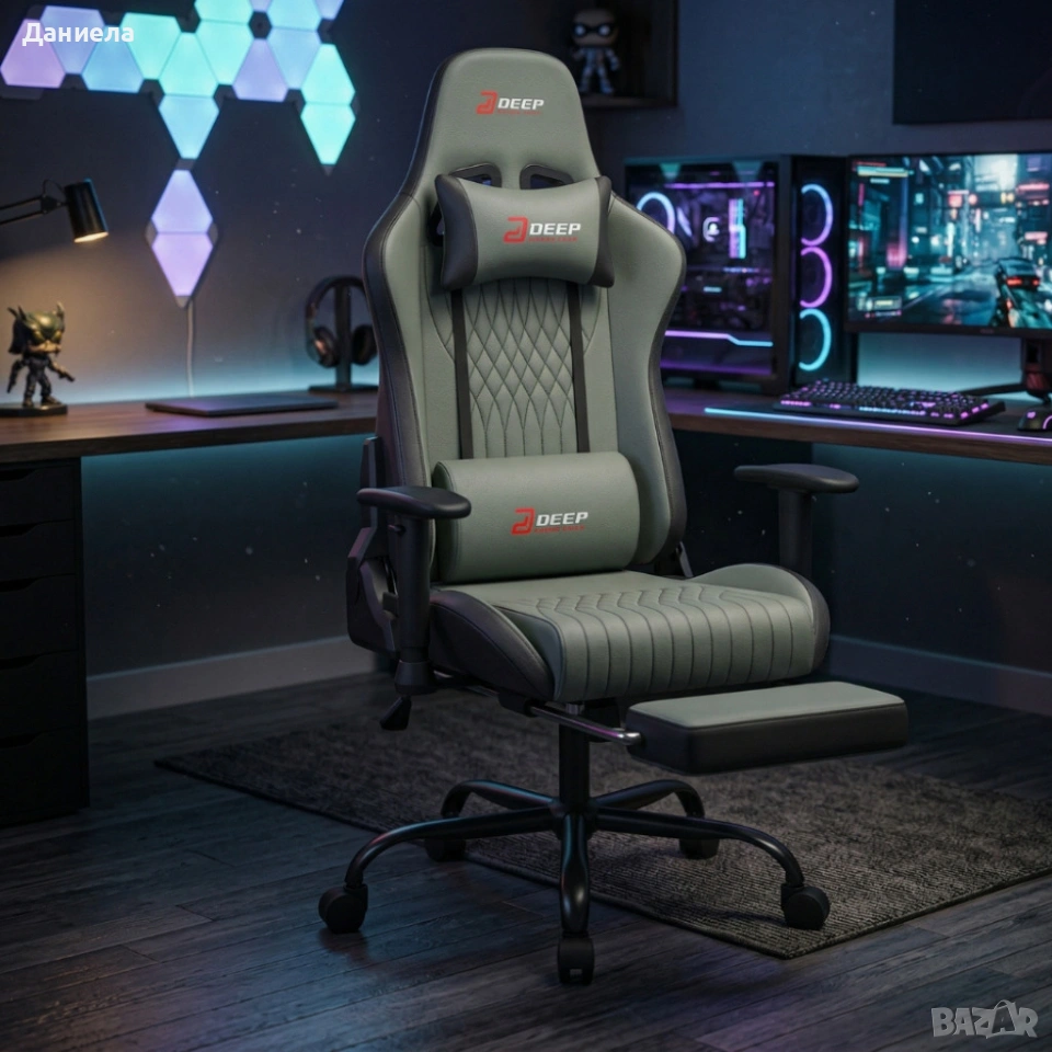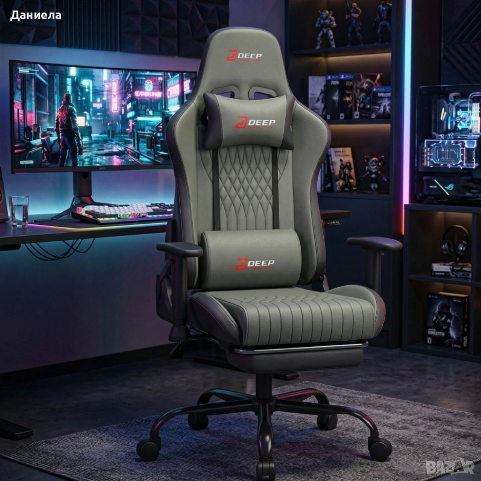 Ергономичен сив геймърски стол с поставка за крака, регулируема височина и 3D подлакътници