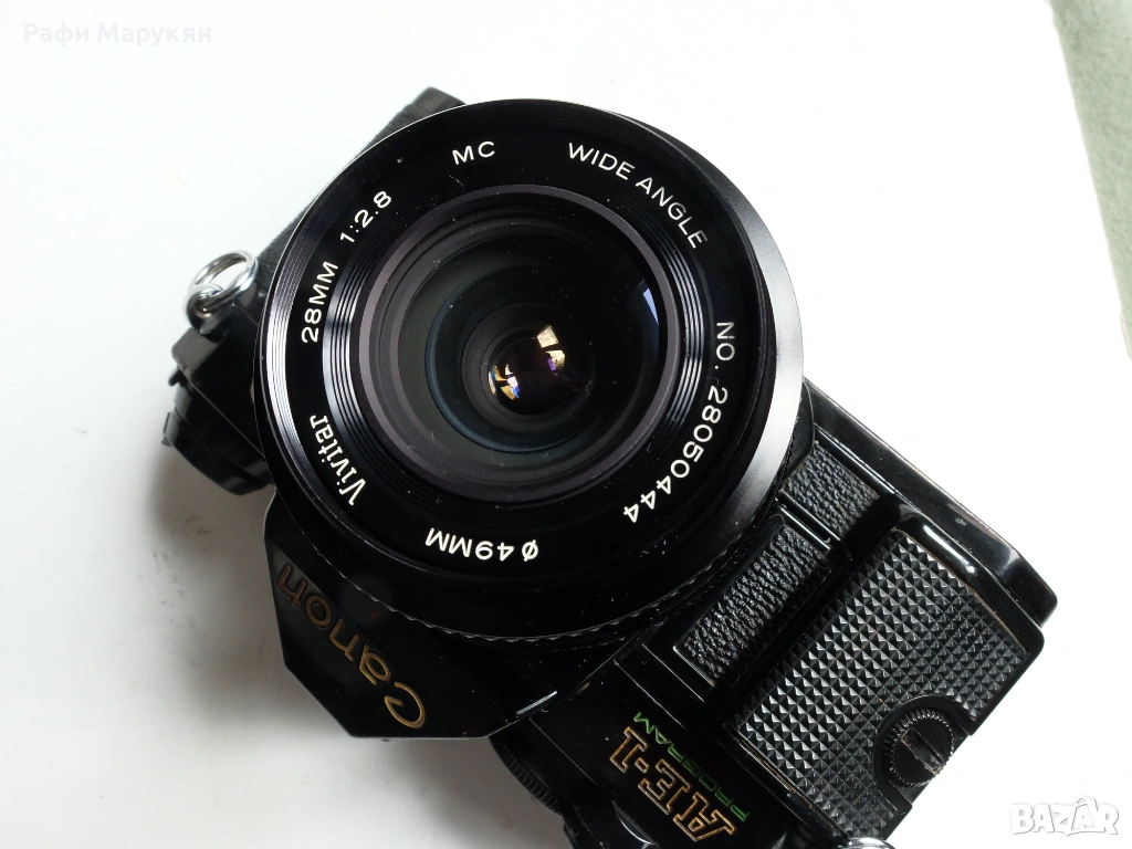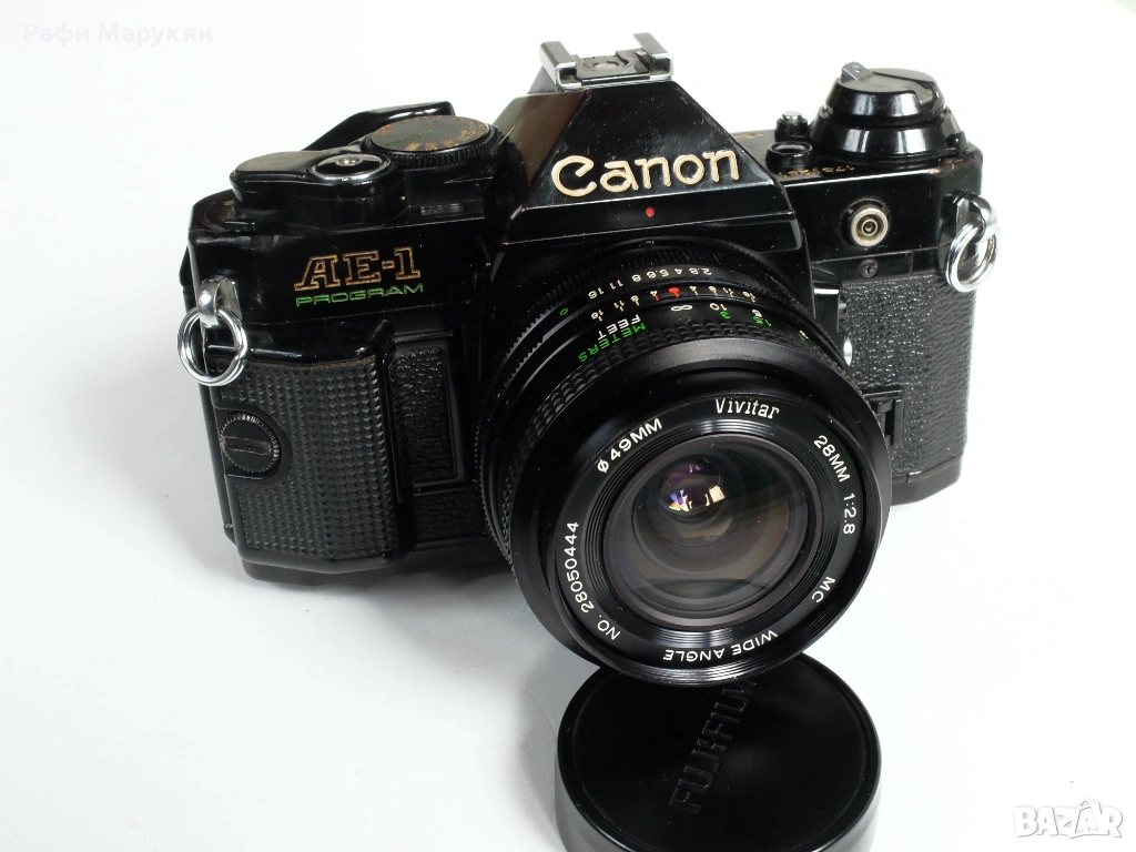 Легендарният ЧЕРЕН SLR"Canon-AE-1 Program" e универсален фотоапарат за начинаещи и напреднали фотографи. Фокален затвор със скорости В, от 2 сек-1/1000. TTL-CdS система на измерване, захранване с батерия 4LR44- 6 V-Работи се с: 1. PROGRAM, камерата избира автоматично, точно измерената бленда и скорост. 2.Ръчно настройване на блендата, показана с LED цифра във визьора при предварително избрана приоритетна скорост. Синхрон със светкавици 1/60. Свтъл визьор с микропризмен растер и клиново устройство за точно намиране на фокуса. Обектив "VIVITAR"-2,8/28 mm МС, изключително остър обектив с голяма разделителна способност, контрастни и наситени цветове. 7 лещи/4 групи, острота 8,9, боке 7,5, най-близо снима 45 см. солиден, метален, без белези, драскотини и гъбички, капачки и филтри М-49. ОБЕКТИВЪТ Е ЧИСТО НОВ