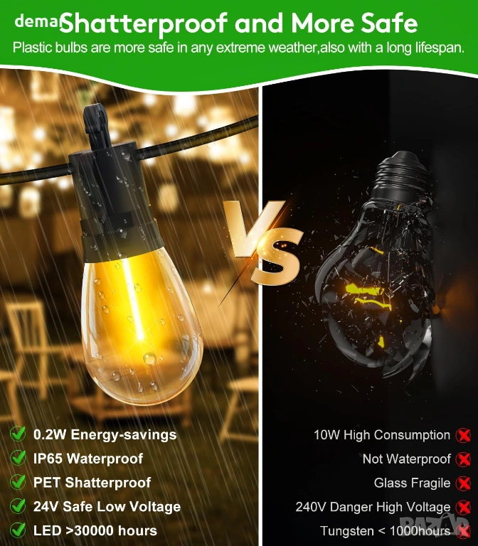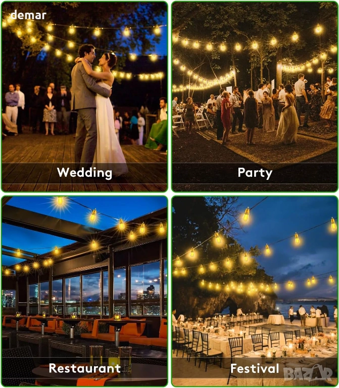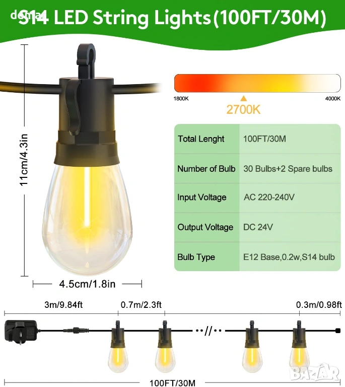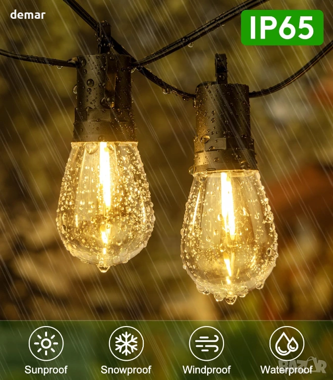 Тези 30-метрови нисковолтови гирлянди за открито са с 30 S14 LED крушки с 2 резервни, излъчващи топла светлина от 2700K, идеални за градини, вътрешни дворове и събития, с възможност за свързване за по-големи пространства. Те включват дистанционно управление, предлагащо 4 нива на яркост, 3 режима на осветление и функция таймер за гъвкави настройки на атмосферата. Изработени с нечупливи крушки и водоустойчивост IP65, те са проектирани да издържат на различни метеорологични условия, като същевременно осигуряват дълготрайна работа. Лесни за монтаж с вградени куки за окачване и дълъг захранващ кабел, те са подходящи за широк спектър от външни инсталации. Енергийно ефективната 24V система намалява консумацията на енергия, като същевременно поддържа постоянно и надеждно осветление за целогодишна употреба.