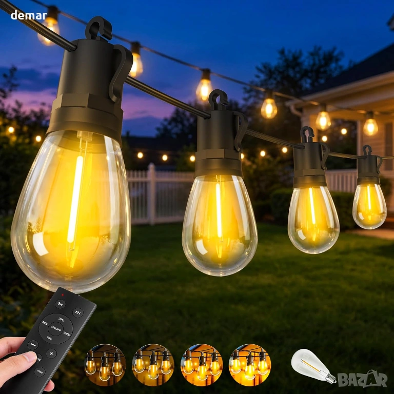 Външни гирлянди, 30 м, S14, 30+2 LED крушки, градинско гирляндово осветление, дистанционно, IP65