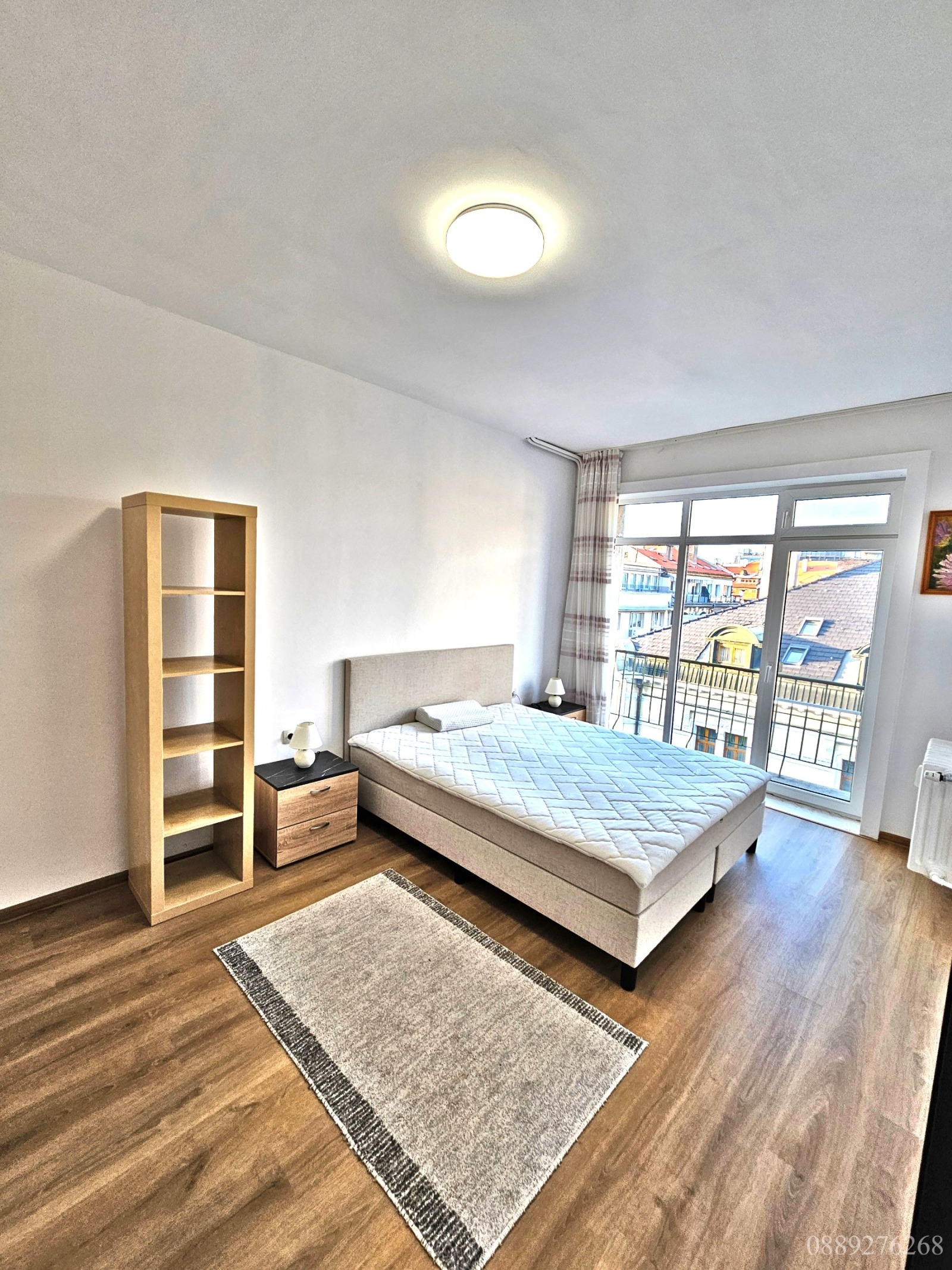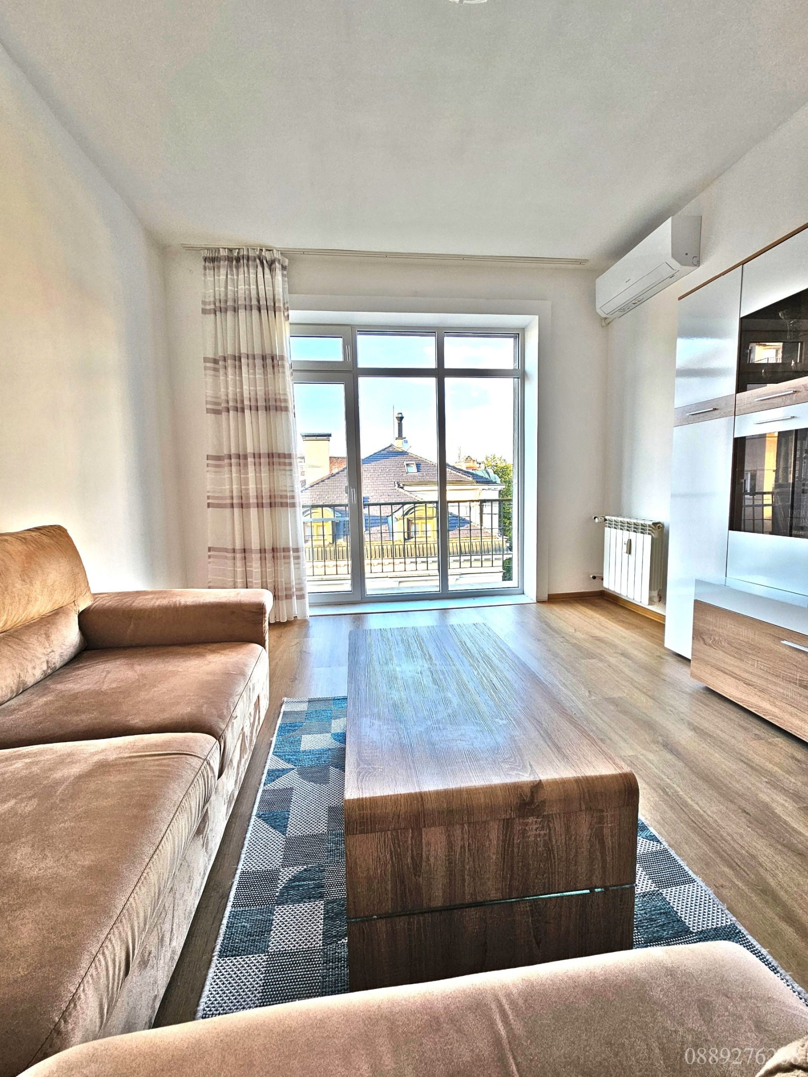 Апартаментът е много светъл, остъклен изцяло с френски прозорци до земята и балкони към всяко едно от помещенията.