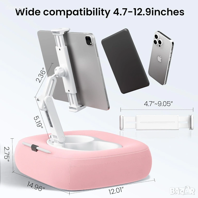 Поставка за таблет/телефон с възглавница, 2 купи, регулируема на 360°, 4.7''-13'', розова