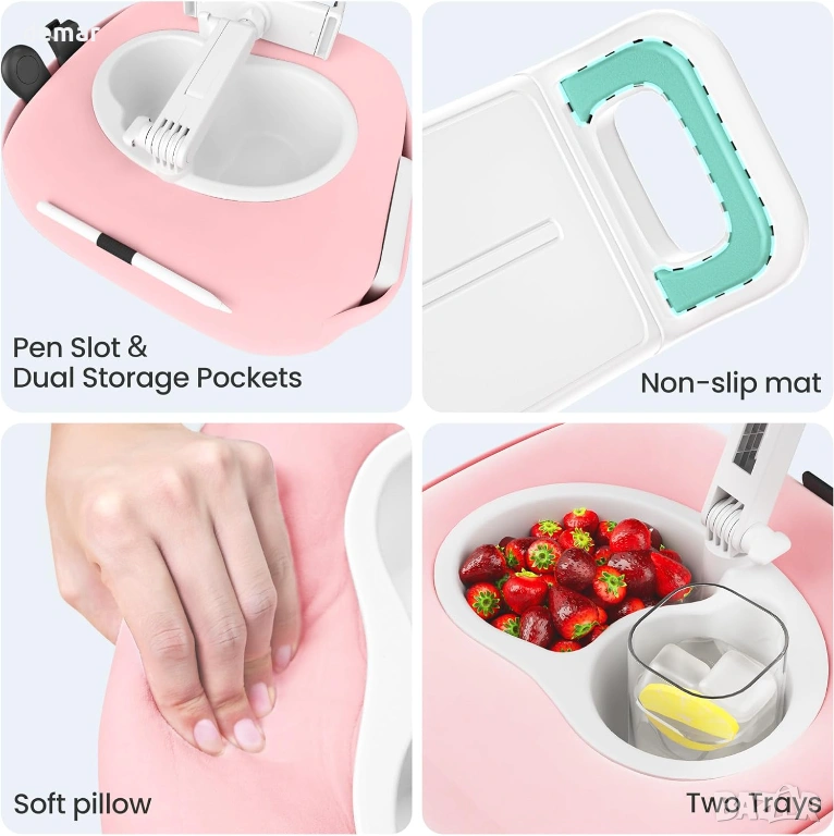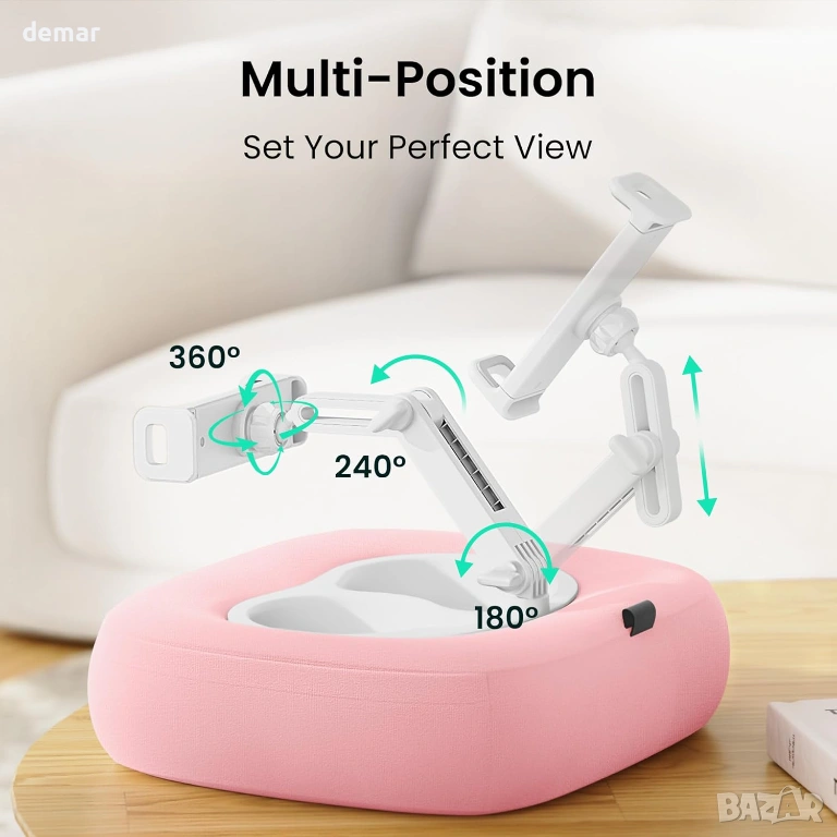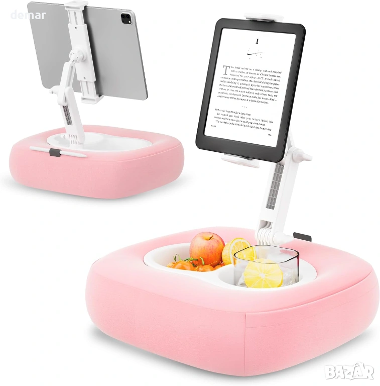Тази многофункционална поставка за таблет/ телефон с възглавница 3 в 1 съчетава стабилен държач за устройство, купа за закуски и отделение за напитки за удобно използване без ръце навсякъде, независимо дали в леглото, на дивана, на работа или по време на пътуване. Тя разполага със здрава правоъгълна основа, двуосно регулируемо рамо с контрол на височината и ъгъла и въртяща се на 360° глава за удобно гледане във всяка позиция, което спомага за намаляване на напрежението във врата и ръцете. Вградените странични джобове и задният слот осигуряват практично съхранение на аксесоари като дистанционни управления, очила или стилуси. Подвижният дизайн позволява лесно почистване, с калъф, който може да се пере, и отделения, които могат да се почистват, а регулируемата скоба сигурно приляга към широка гама от устройства - от смартфони до таблети до 13 инча.