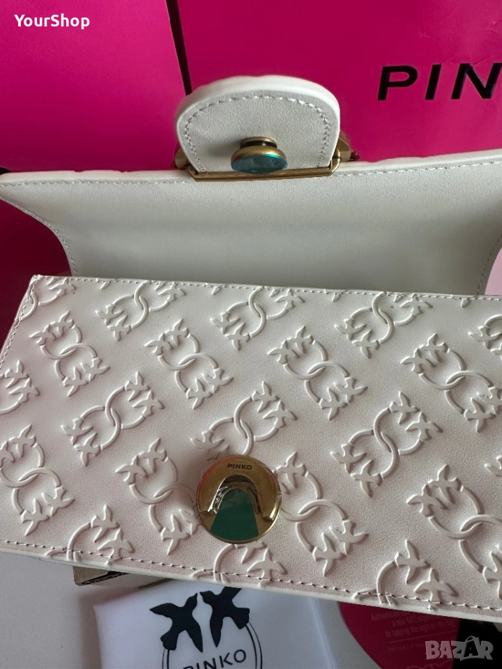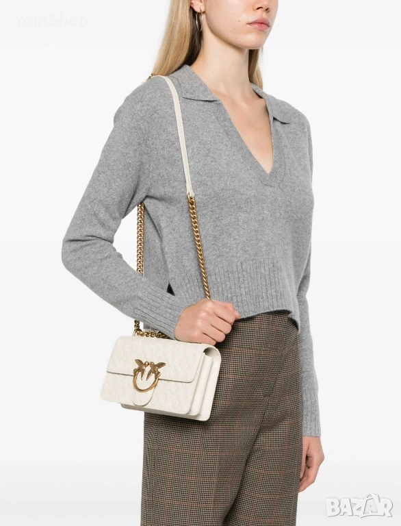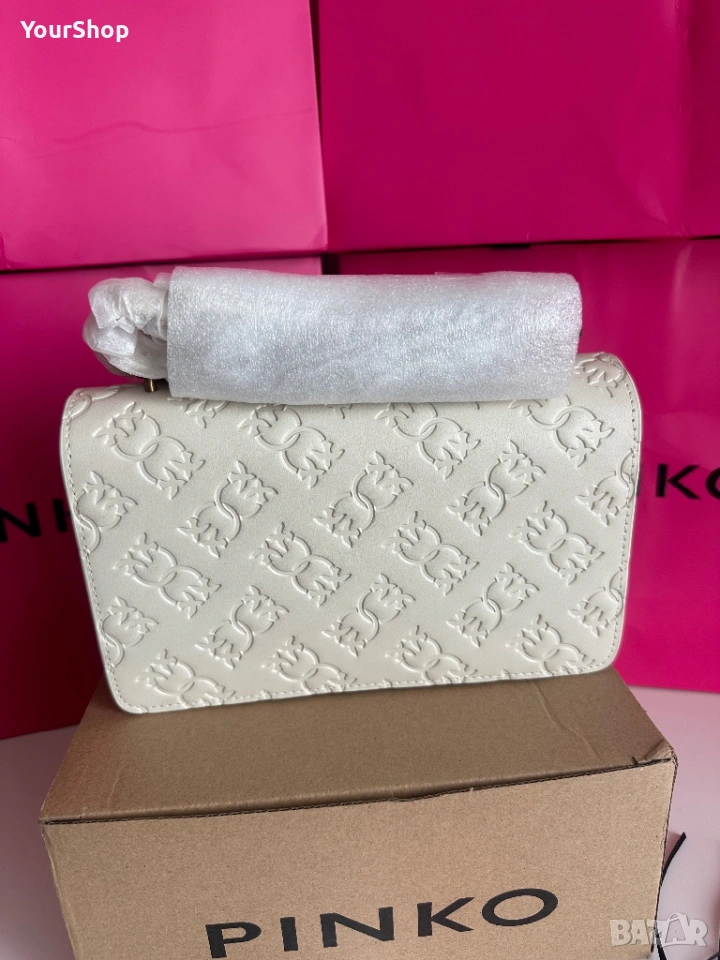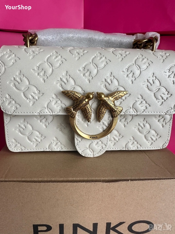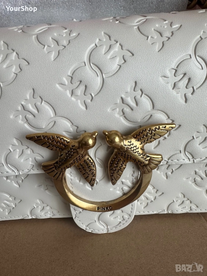 PINKO Love One Mini Dc crossbody bag, чисто нова с етикет. Изработена от 100% телешка кожа с луксозна копринена подплата. Класически бял цвят и емблематичен Love Birds метален елемент в златисто.