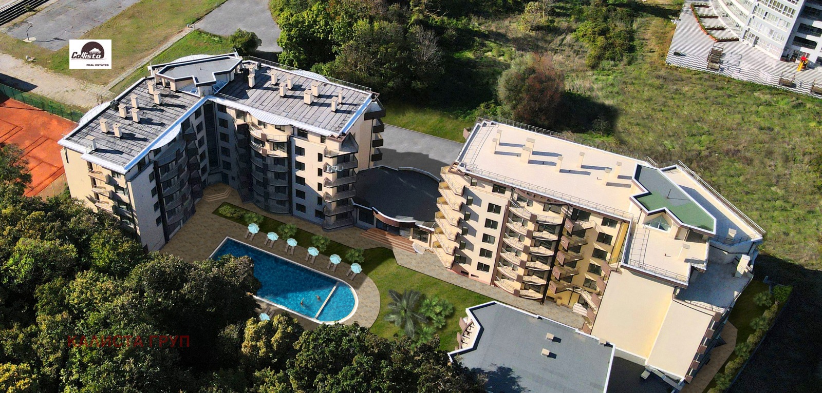 На разположение в комплекса са озеленен двор, външен басейн и вътрешен басейн.