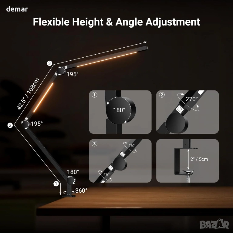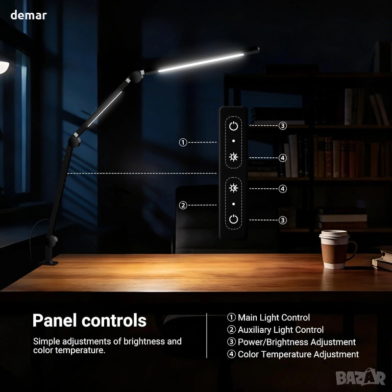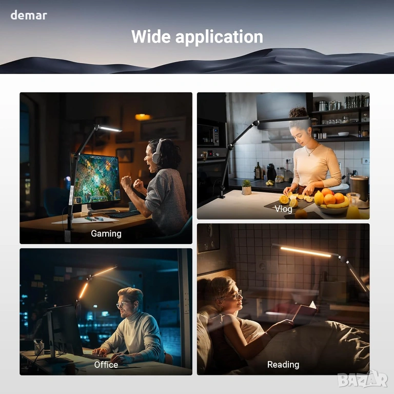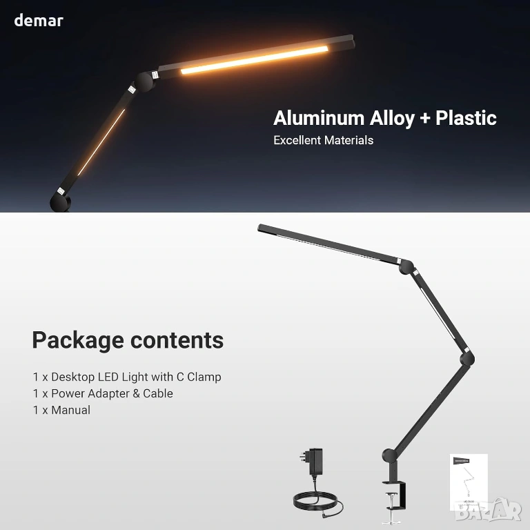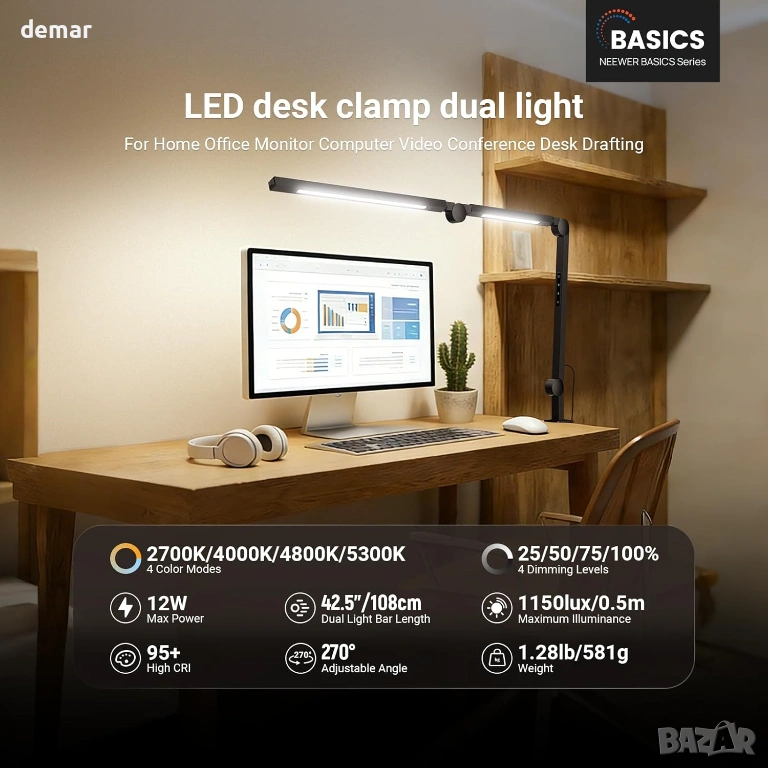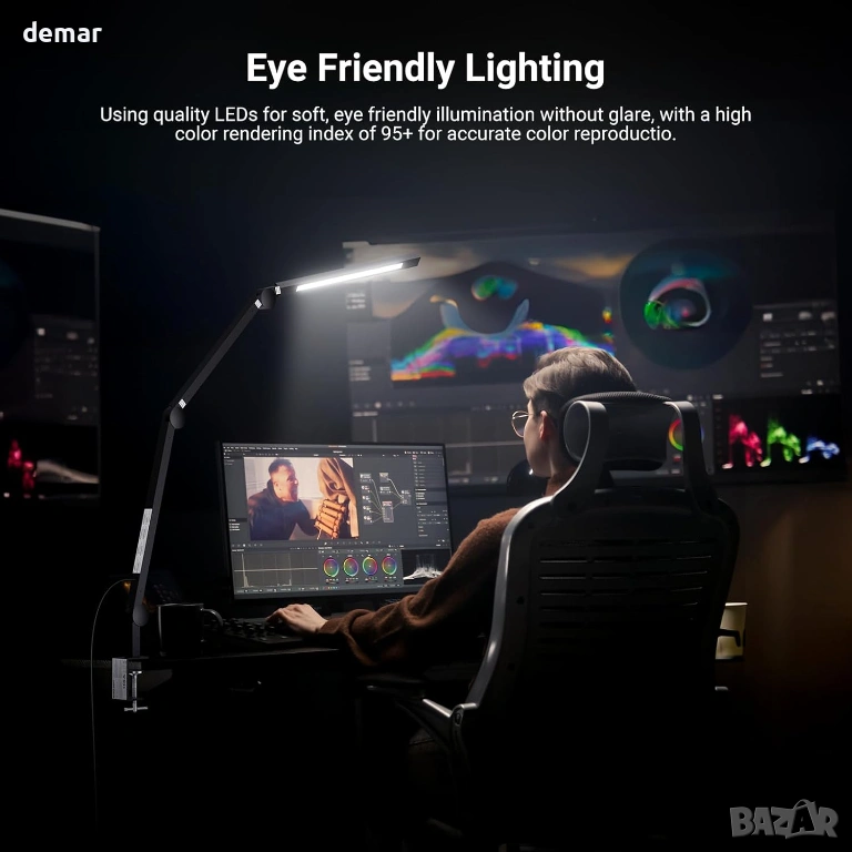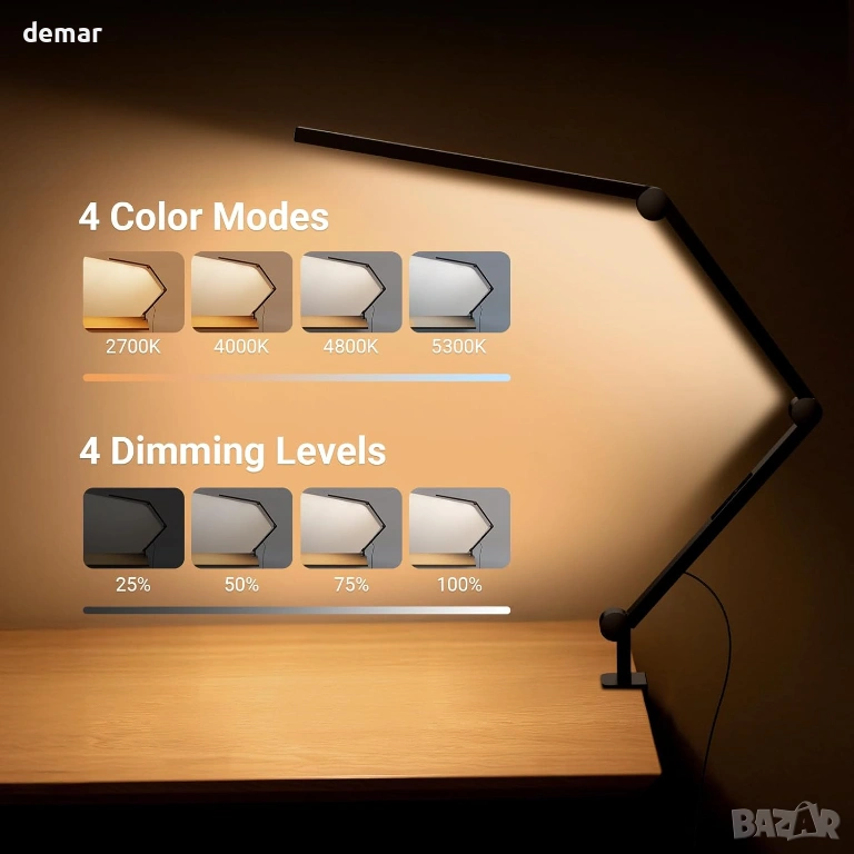 Тази настолна LED лампа разполага с двойни светлинни ленти, осигуряващи широко, равномерно осветление до 1150 лукса, идеална за работа, учене, видео разговори и чертане, като същевременно спестява място на бюрото благодарение на дизайна със скоба. Използва висококачествени CRI95+ светодиоди с дифузер, за да създаде меко, приятно за очите осветление, подходящо за дълги сесии. Лампата предлага персонализирано осветление с четири режима на цветна температура и четири нива на яркост за различни среди. Регулируемият ѝ дизайн включва висока конструкция със седем шарнирни съединения, накланящи се на 270° светлинни ленти и въртящо се, сгъваемо рамо, което позволява прецизно позициониране и гъвкава употреба при различни задачи.