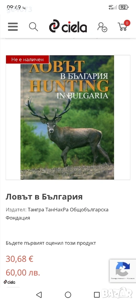 Hunting in Bulgaria“ продължава традицията на издателство ТАНГРА ТанНакРа за атрактивно представяне на културно-историческото наследство и природното богатство на България. Албумът представя историята на лова и риболова по българските земи от най-древни времена досега, проследява възникването на съвременното ловно движение и организация на лова, запознава със състоянието и възможностите на изявени ловни стопанства, с ловни трофеи, с видни български ловци. Интересен акцент е представянето на ловната тематика в художественото творчество. Текстът е умело балансиран с богат илюстративен материал. Издание: богато илюстрирано, луксозно, пълноцветно издание Език: паралелен текст на български и английски език Корици: твърди корици Размери: 21.5 x 28.5 см Страници: 324 стр. Пакетиране: индивидуално пакетиране Автор: авторски колектив Издателство: ТАНГРА ТанНакРа Съдържание на книгата-албум „Ловът в България | Hunting in Bulgaria“ I. Данни за Република България II. Кратка история на българите и България. Сведения за лова по българските земи от древността до Освобождението от османско робство III. Организирано ловно и риболовно движение в България III. 1. Великотърновският ловен кръжец – първото ловно сдружение в България III. 2. Създаване на ловната организация, на Българския рибарски съюз и обединяването им в Народен ловно-рибарски съюз – кратка история и структура на управление III. 3. Ловците – пазители на българската природа. Начални стъпки III. 4. Първите стъпки на организираните въдичари III. 5. Развъждане на дивеч и риба. Производствени стопанства III. 6. Ловно законодателство III. 7. Национални ловни събори III. 8. Спортна дейност. Ловна стрелба. Риболовни дисциплини III. 9. Трофейно дело III. 10. Кинология III. 11. Международният съвет по лова и опазването на дивеча (CIC) и националната ловна организация. Международно признание и контакти III. 12. Първата значка и знаци за отличие III. 13. Списанието на националната ловна организация III. 14. Издателска дейност III. 15. Библиотека и музейна сбирка на НЛРС–СЛРБ III. 16. Председателите на организацията IV. Ловната тематика в художественото творчество IV. 1. В българската художествена литература IV. 2. В българското изобразително изкуство IV. 3. Ловът в литературата V. За лова – с усмивка (Ловни вицове) VI. Дивечът на трапезата (Кулинарни съвети и рецепти) VII. Приложения VII. 1. Особености и организация на ловното стопанство в България (Кратък преглед)