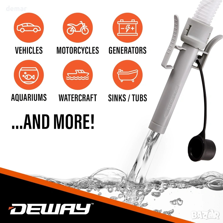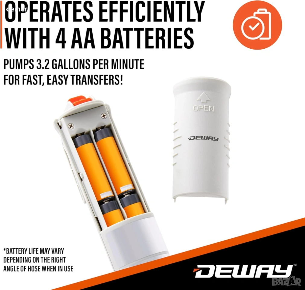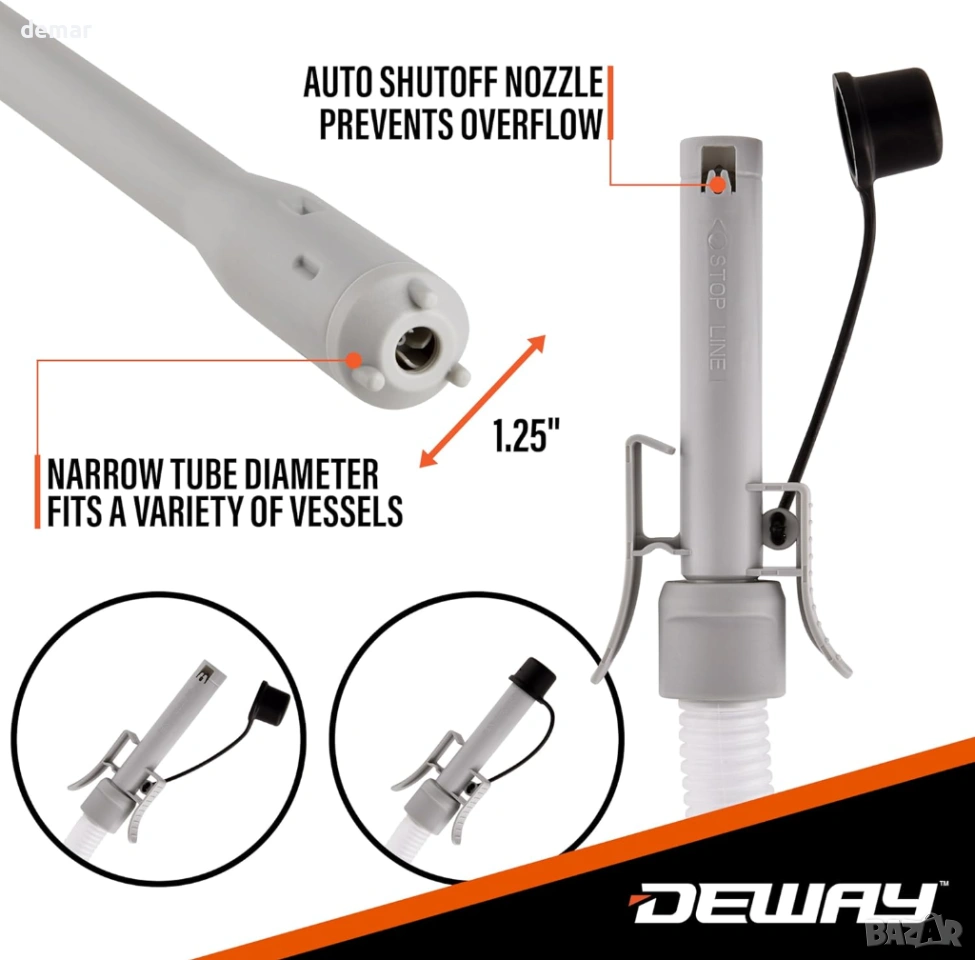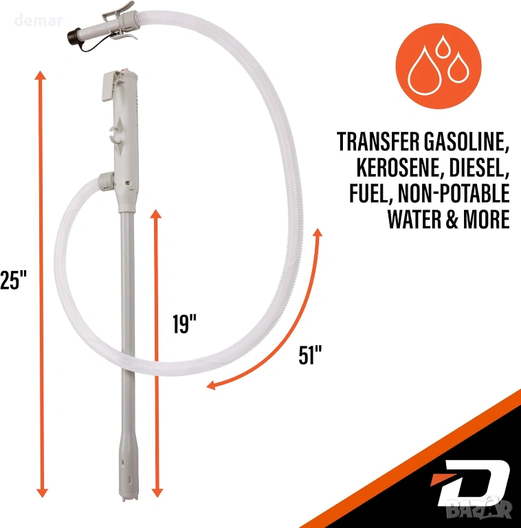 Помпа за прехвърляне на гориво, захранвана с батерии, проектирана за бърза и безпроблемна работа с некорозивни течности, с автоматична затваряща дюза, предотвратяваща преливане и разливане за прецизна работа. Оборудвана с мощен мотор, осигуряващ бързи скорости на прехвърляне до 14,5 литра в минута, тя елиминира необходимостта от повдигане на тежки предмети и опростява задачите по зареждане или източване. Включва дълъг прозрачен маркуч за подобрен обхват, видимост и безопасност, както и удобна щипка за сигурно съхранение без капки. Универсалната всмукателна тръба тип пръчка е съвместима с повечето стандартни туби без адаптери, което я прави подходяща за широк спектър от приложения, включително превозни средства, оборудване, прехвърляне на вода и общи домакински приложения.