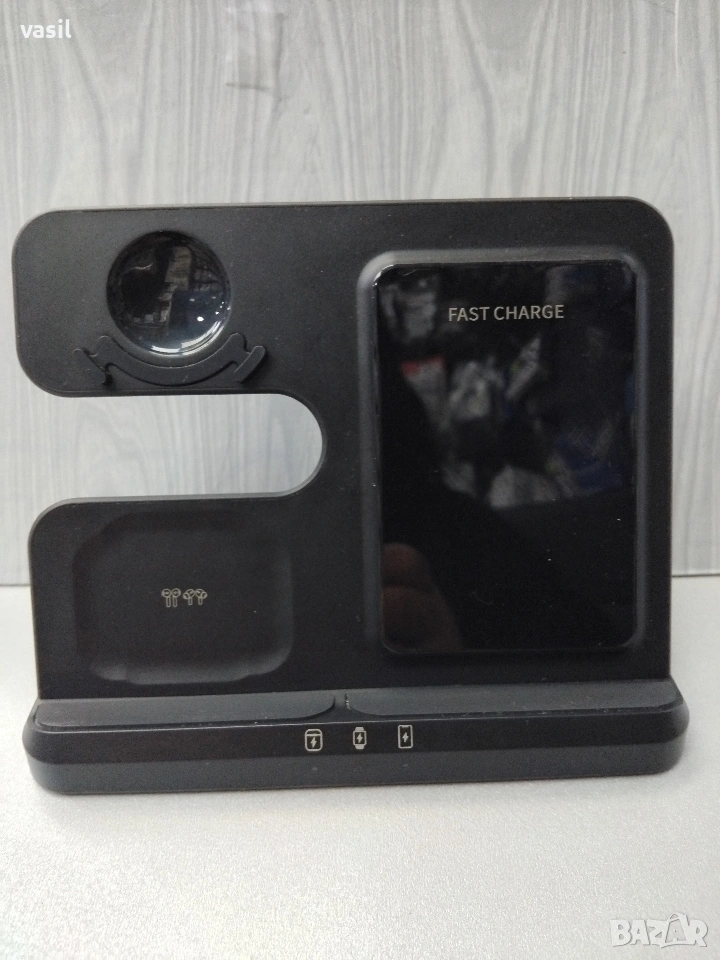 Продавам 3 в 1 безжична станция за зареждане на телефон, смарт часовник и слушалки.