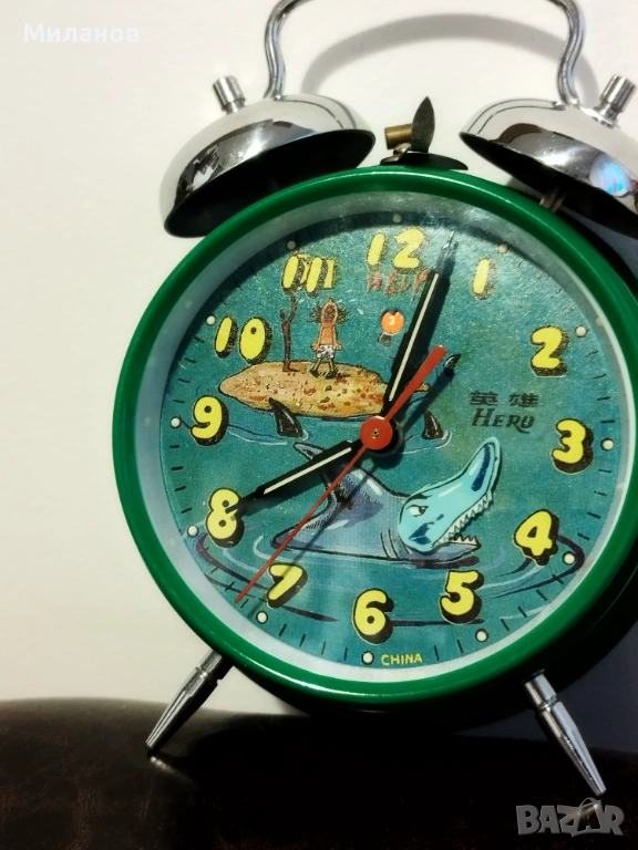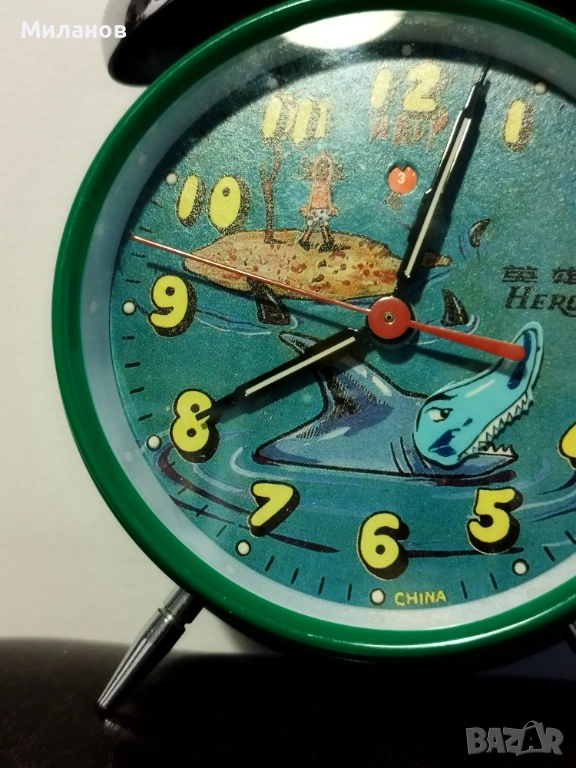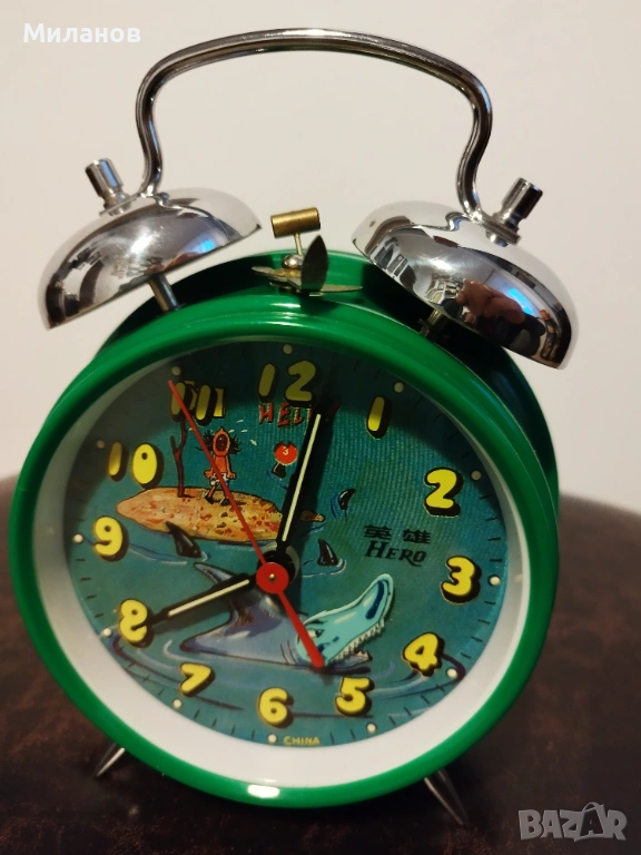 Стар механичен анимиран китайски будилник Hero.Отремонтиран и смазан, работи и звъни.Диаметър-124 милиметра.Номер на часовника-155707