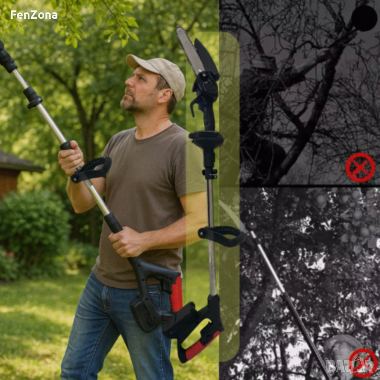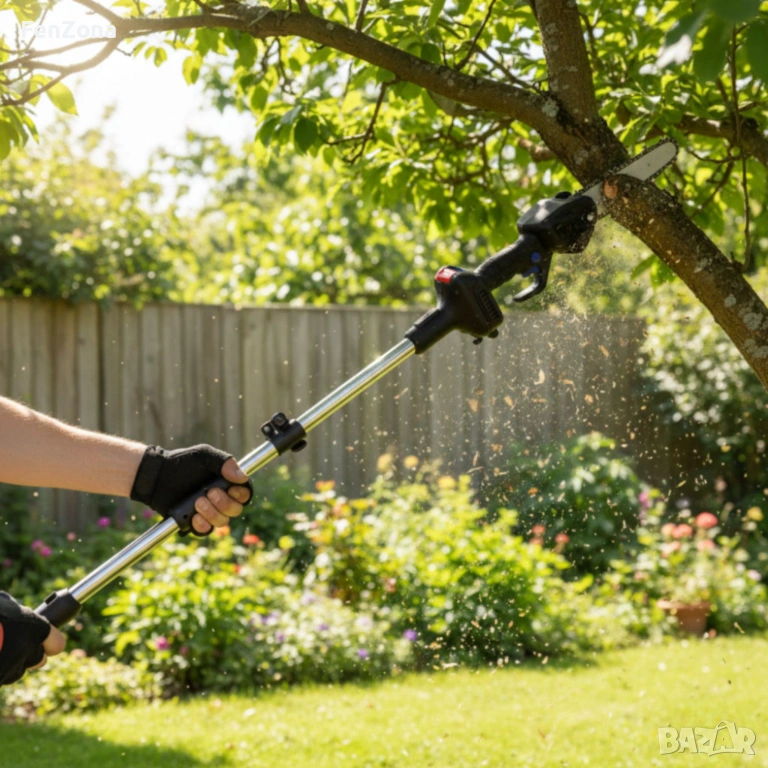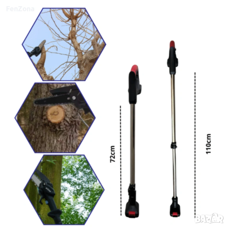 Тип продукт: Мини акумулаторен верижен трион + телескопичен удължителен прът;